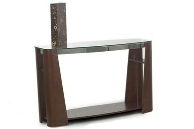 The Dark Cherry & Glass Sofa Table is a fabulous addition to the modern living scheme. Rich mahogany meets metal and glass to form the futuristic design. The thick beveled glass top, brushed nickel and the expansive wood panels are curved to form support.