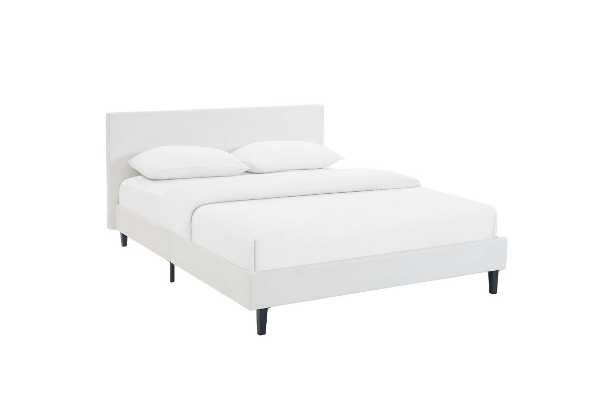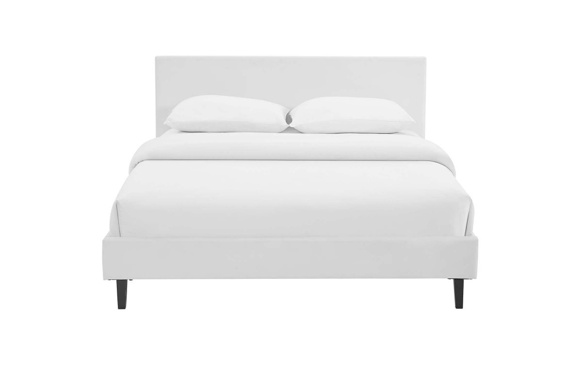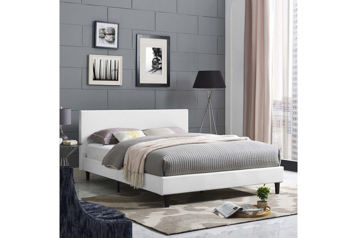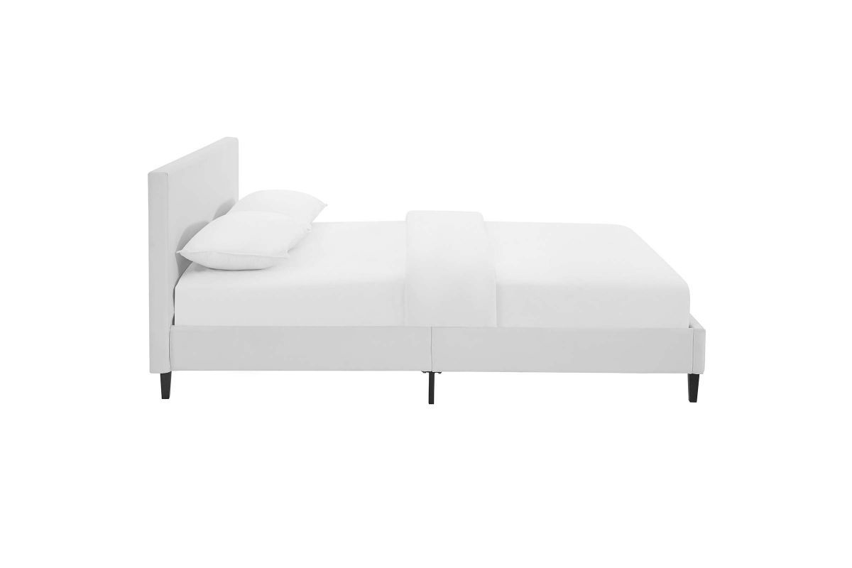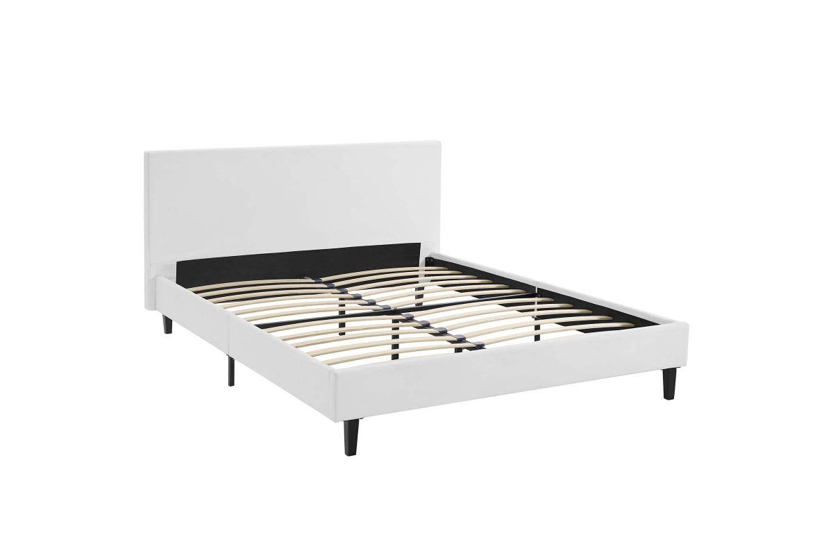 Restyle your bedroom decor with the Anya Platform Bed. Designed with a chic avant-garde look, Anya comes with a padded vinyl base and headboard, solid wood legs, and a slatted wood support system that eliminates the need for a box spring. Complete with a reinforced center beam with supporting legs for maximum stability, Anya accommodates the various mattress types on the market such as memory foam, spring, latex and hybrid. A sleek and striking centerpiece to your bedroom, Anya is a quality modern bed poised to thoroughly transform your space. Weight capacity up to 1300 lbs. Mattress Not Included.