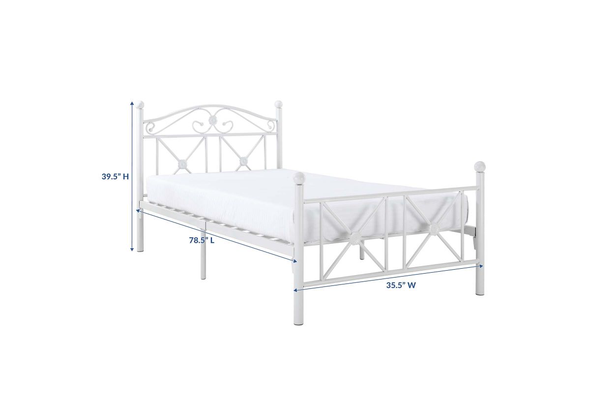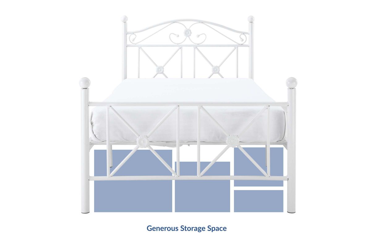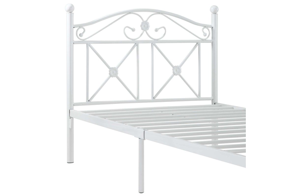 Calming simplicity beams from the high gloss white finish of the Country Cottage Bed Frame. Upright metal posts topped with round ball finials add a quaint and relaxed look, while a peaceful header and footer have a lattice work design that speaks serene.
