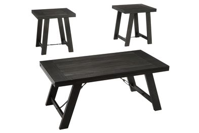 Introduce a handsome country feel in your living area with this casual occasional table set. Planked tops with a breadboard layup supported on canted legs give this set a distinctive farmhouse look. The vintage distressed black wash finish combined with the end tables' leg stretchers and coffee table's tension bars deliver a sense of industrial antiquity that makes this set look robustwhat a sharp look that transcends time.