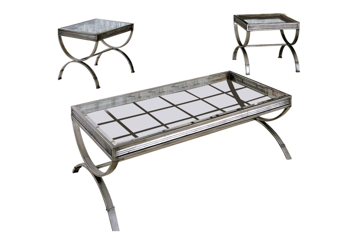 The Metal & Glass Occasional Table Set of 3 is a great looking occasional table set, equipped with a Cocktail Table and 2 End Tables this set will turn your living space into a stylish retreat. This transitional set features an hourglass base and windowpane glass top that gives the tables an understated elegance you will appreciate. The neutral silver powder-coated finish will fit with traditional, cottage or contemporary decors. Cocktail Table: 52Wx26Dx18H End Table: 24Hx22Dx22W