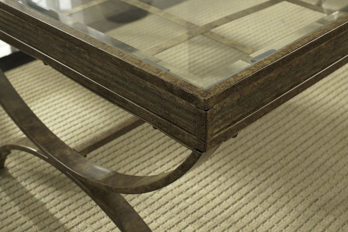 - Constructed of metal bases with hour glass legs, cross stretchers, decorative aprons and metal grid work under tempered glass tops