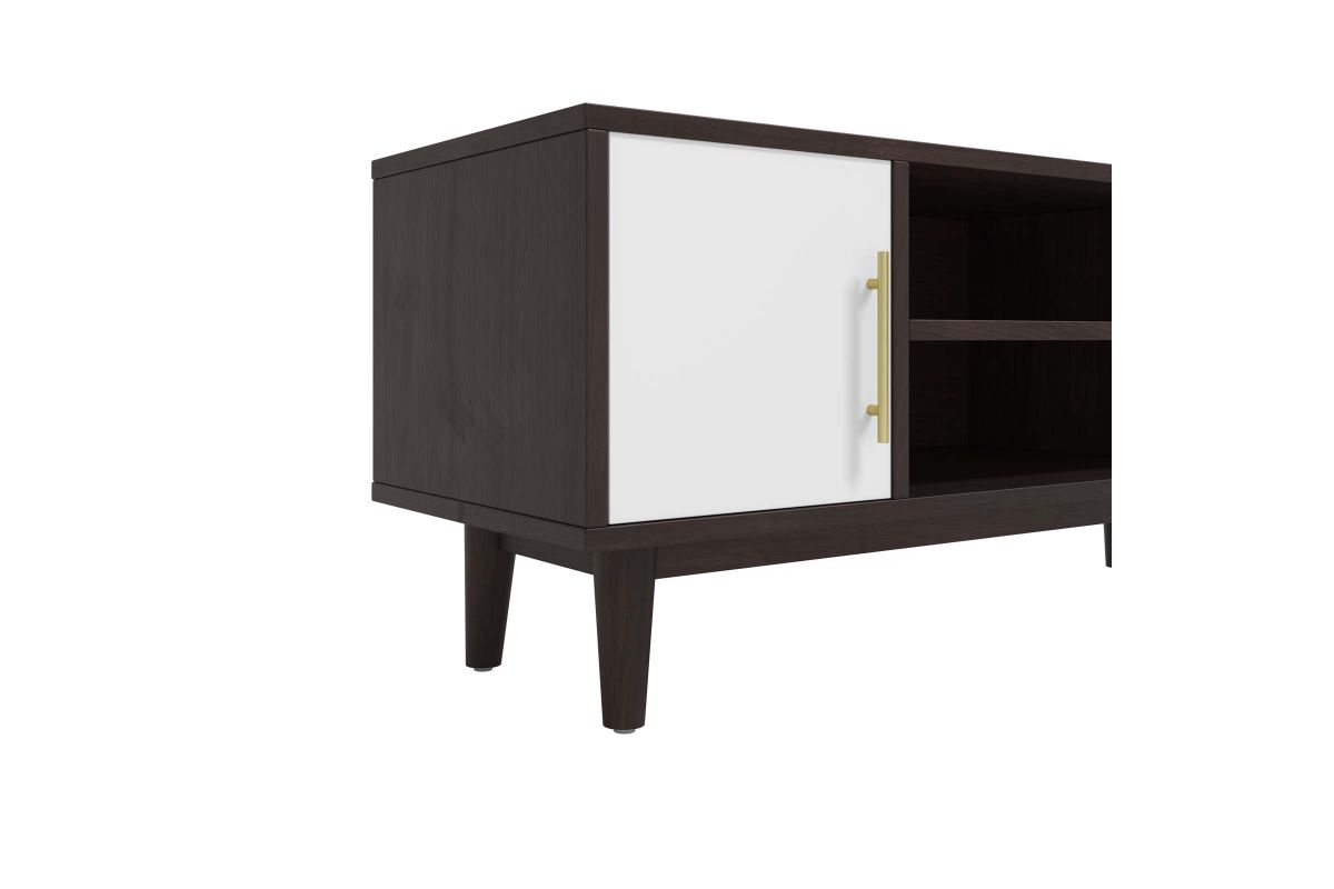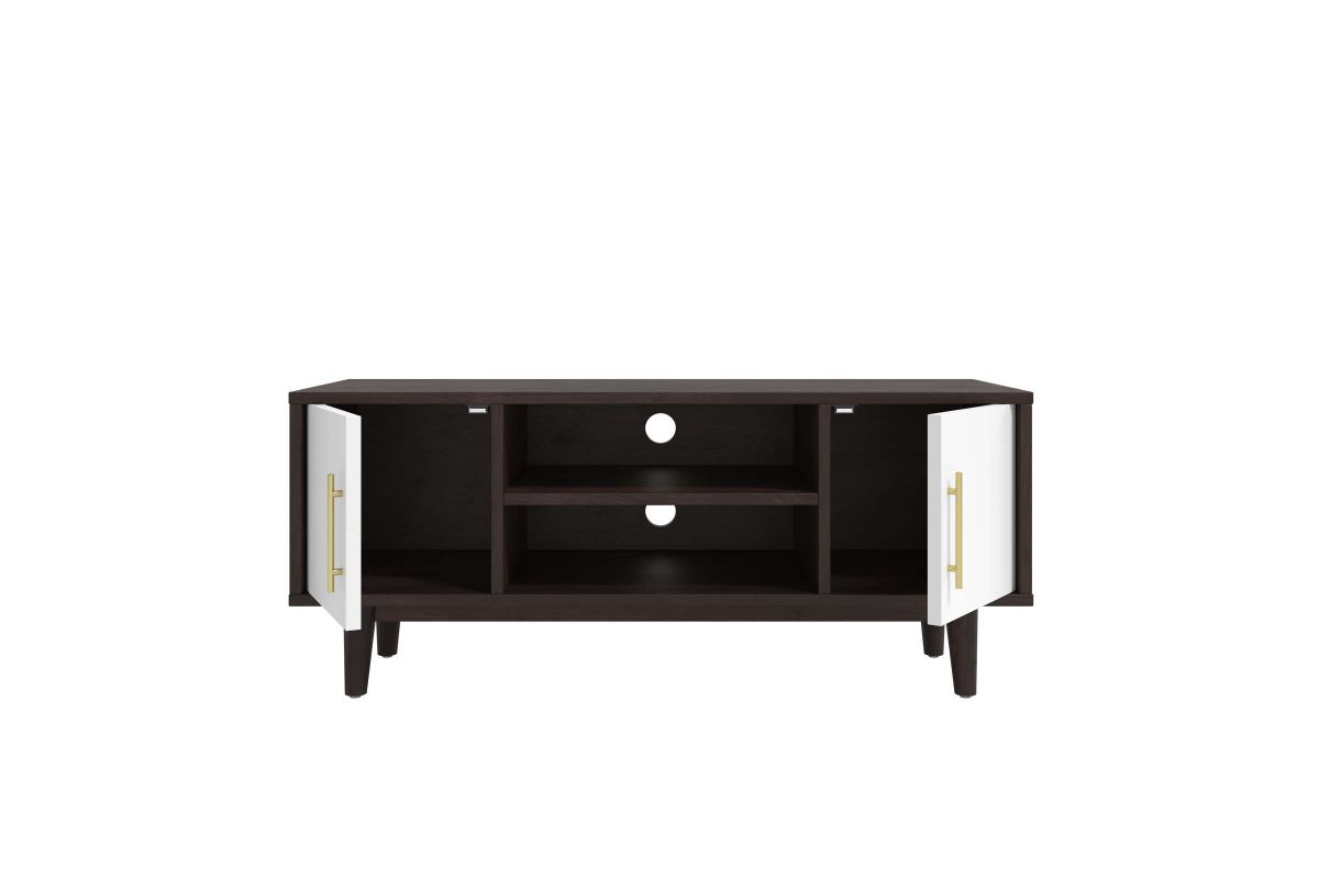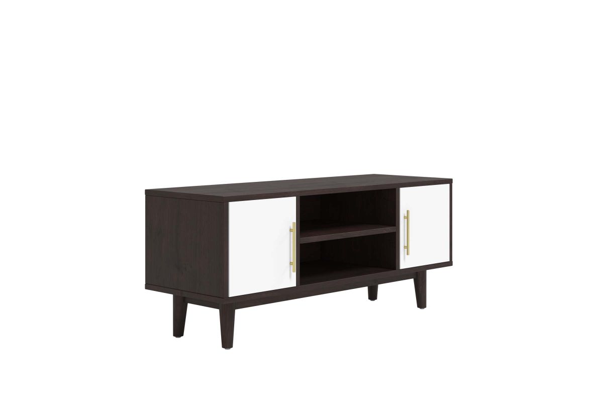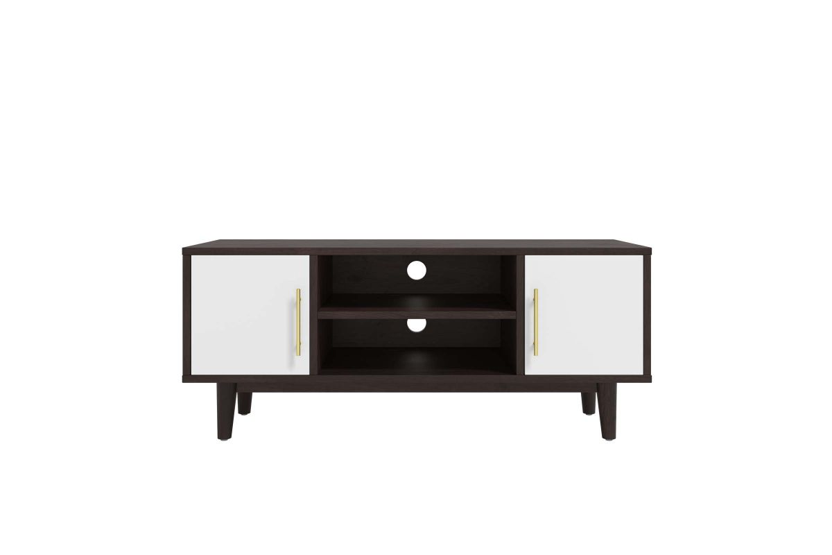 Encourage mid-century modern design in your living space with the Daxton 43" TV Stand. Sleek lines, splayed legs, gold metal hardware, and contrasting tones create a striking piece for your living room, bedroom, lounge room, or home office. Made with particleboard, MDF, and beautiful wood grain paper lamination, Daxton features ample storage space with an adjustable center shelf and two storage areas behind solid white doors. Cable management holes make this entertainment console ideal for keeping all your media essentials organized. A versatile addition, this television stand can accommodate TV's up to 46" and also serves as a display stand for home accessories, decor, and more. Includes non-marking foot pads.