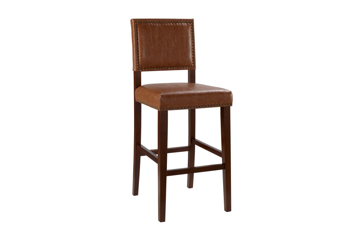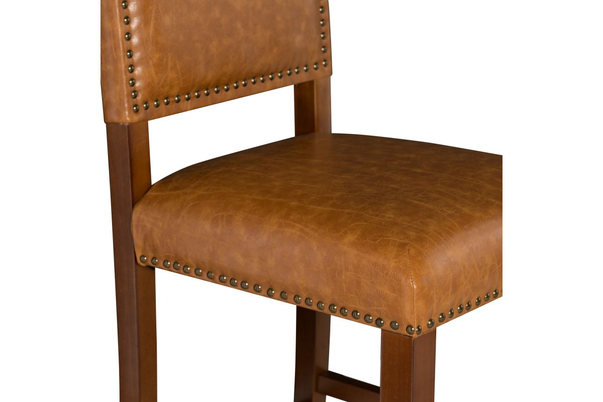Accent your kitchen with this transitional bar stool. Ideal for casual drinks and dining around a bar, or games at a pub height table, this stool works best with bars with heights of 41" to 43" H. The solid wood frame is sleek yet sturdy with walnut stained legs and foot rails. Tonal caramel color faux leather upholstery is luxurious and a breeze to clean. Antique bronze nail head trim adds a classic accent. Place several around your bar to make a stunning statement.
