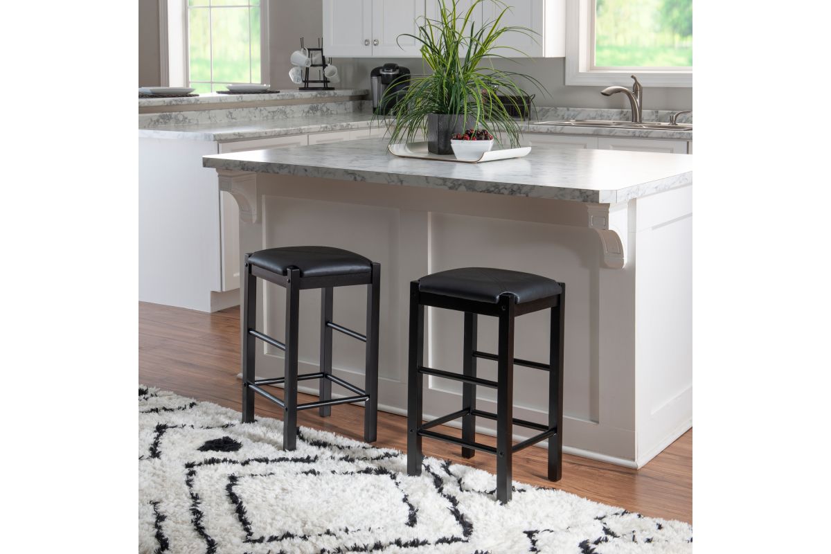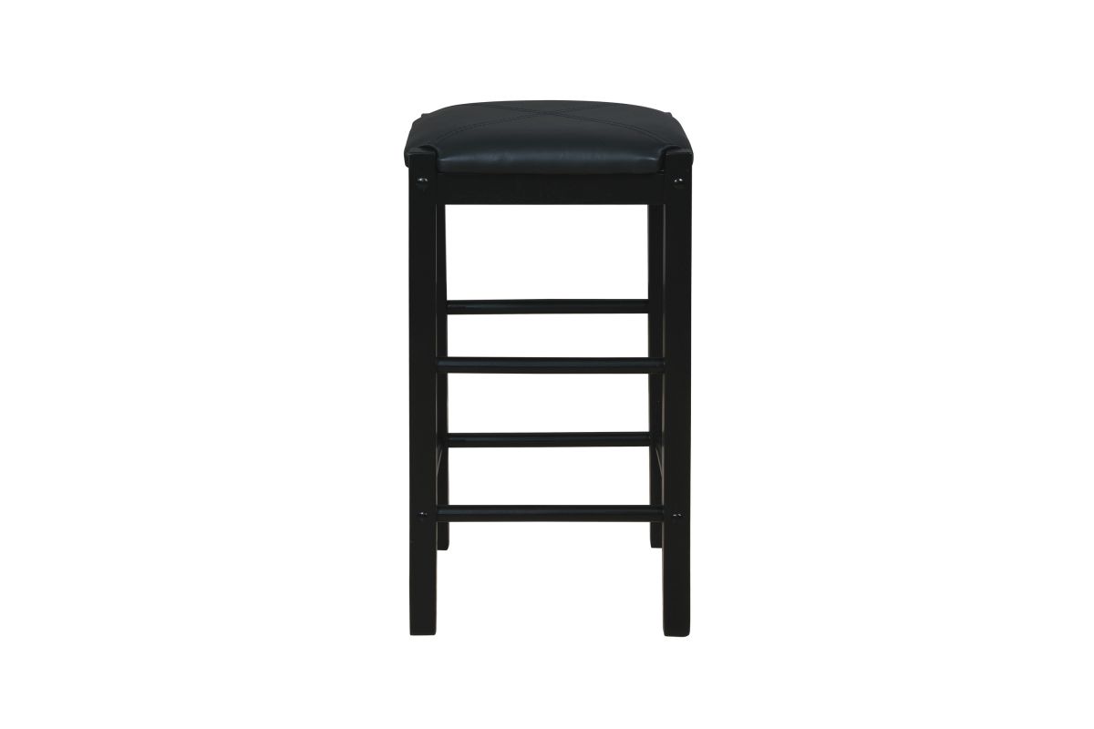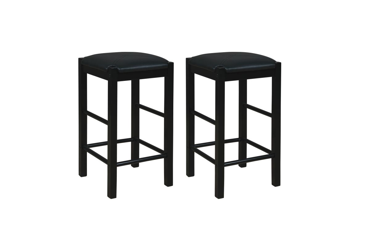 Versatile, space saving two pack set of backless counter height stools can add comfortable seating to any gathering height table or kitchen counter. Featuring padded black faux leather upholstered seat. Each made with solid woods in black and designed to match it's companion counter table set. Purchase includes two stools.