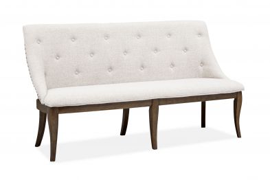 The Roxbury Manor Upholstered Dining Bench features a fully upholstered seat and back in an oatmeal fabric with nail head trim. While the back of the chair is fully upholstered with button tufting, it is deconstructed to show the ladder back. The wood bench frame is finished in a homestead brown finish.