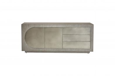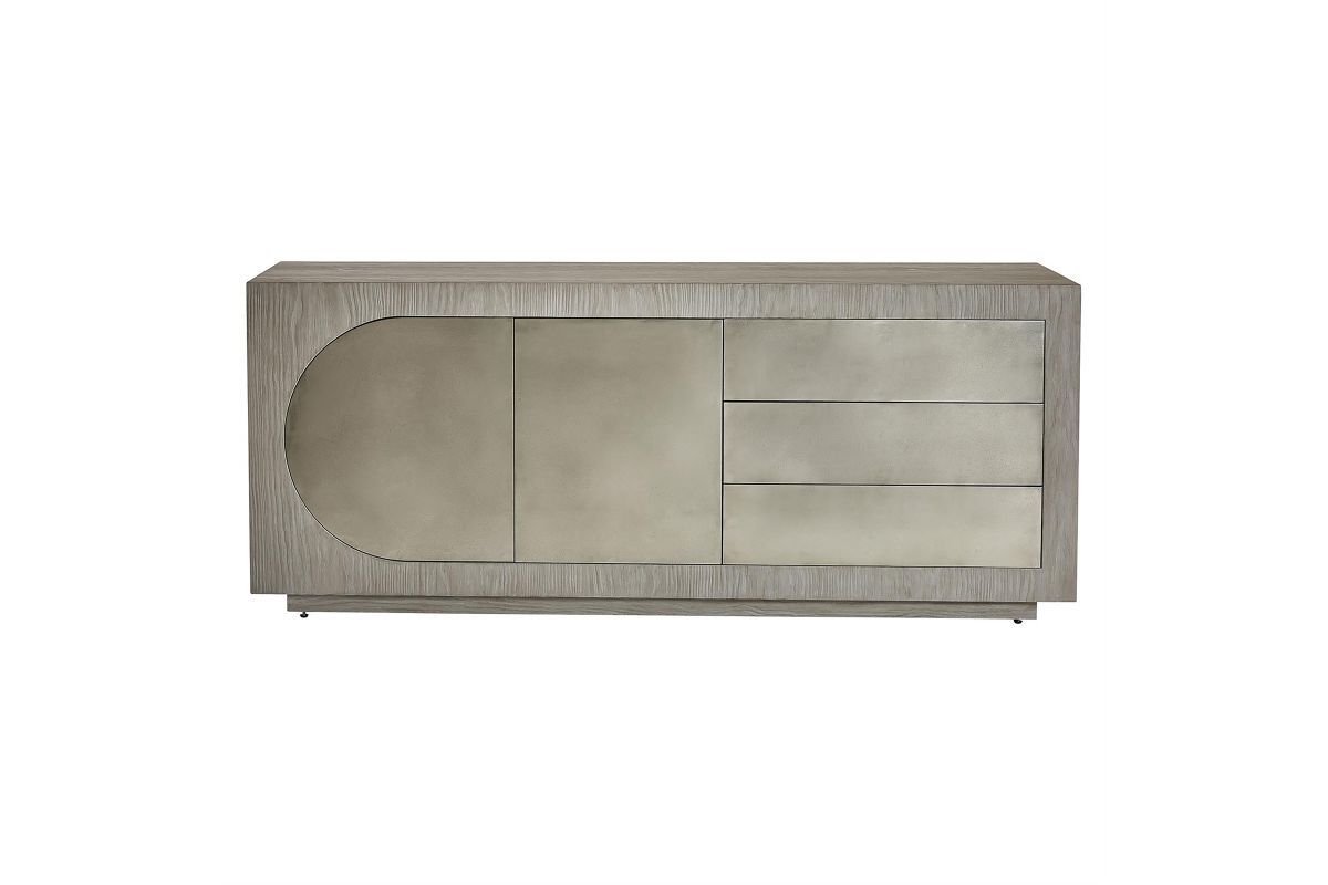 The Trianon buffet is defined by striking metal shapes across the front of the case. Cast aluminum creates a continuous design on the two door fronts and three drawers, connecting together for a beautiful look. Behind the two doors are fixed and adjustable shelves, and the top drawer features a Guardian cloth silverware insert.