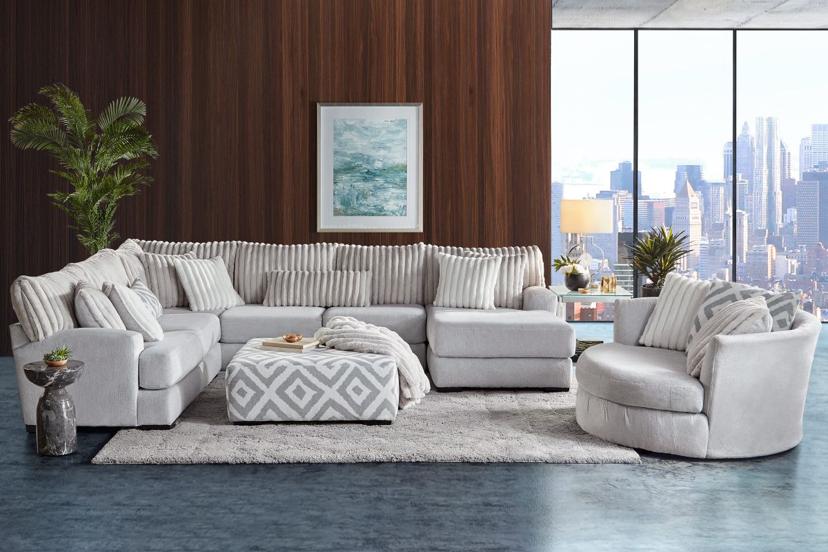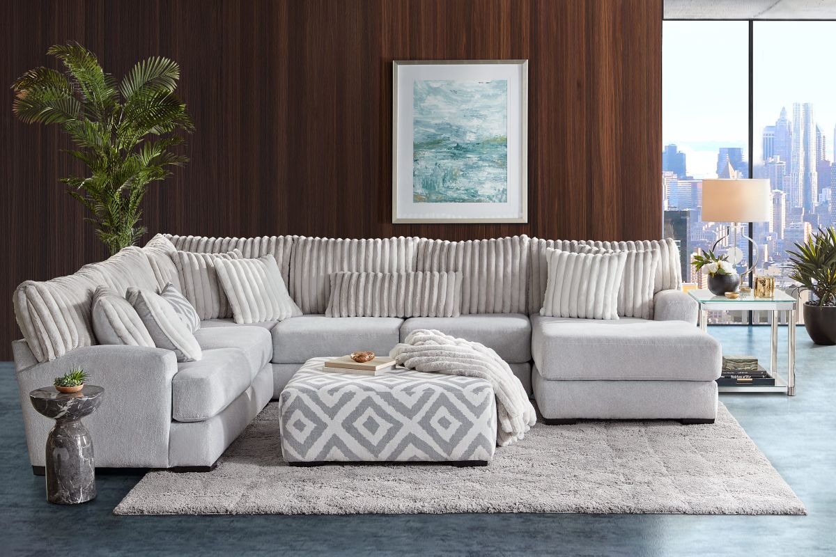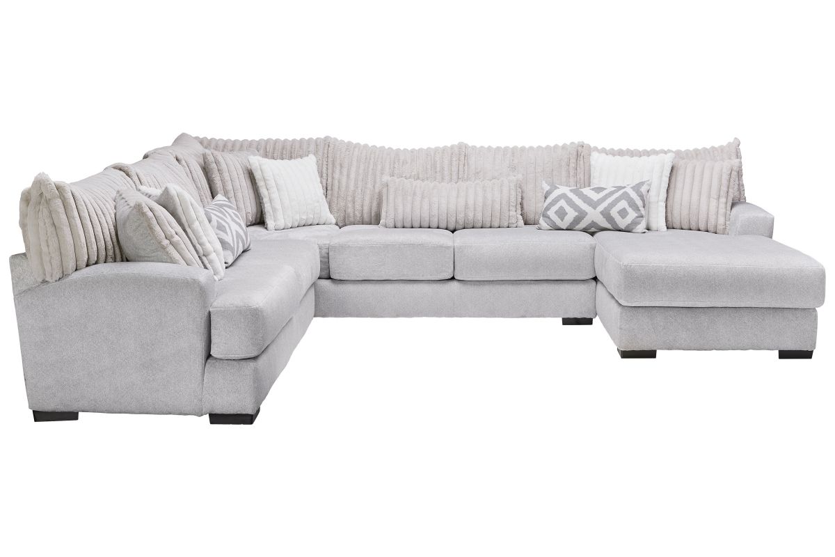 Modern and stylish, the Chloe Sectional takes ultra-comfort to the next level. Featuring exceptionally lush, soft to the touch upholstery while boasting vertical channel tufting on the back cushions, this collection brings a modern look to your living space. The thick track arms bring a sleek, squared off look to the oversized frame while the accent pillows bring a geometric twist. Bring bold texture to your space with the Chloe Sectional.
