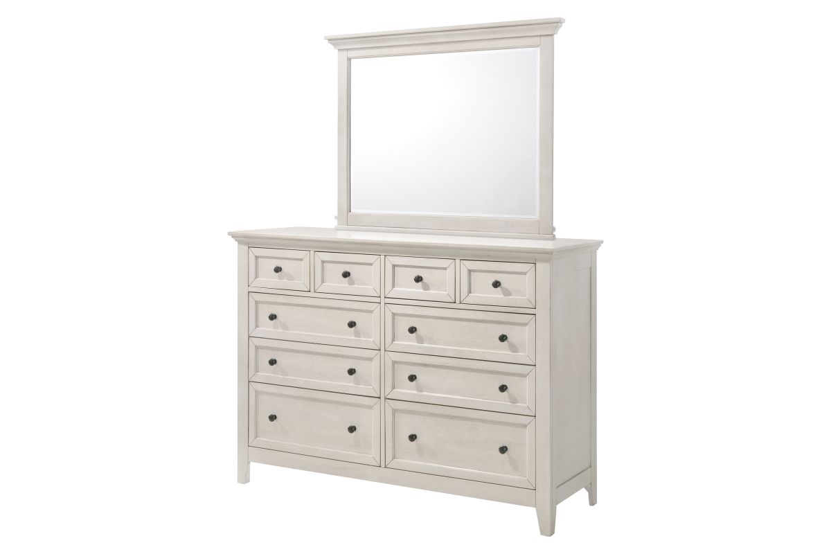 The San Mateo White 10-drawer dresser & Mirror features simple clean line and provides ample storage for your belongings. Featuring extension ball bearing drawer guides and dovetail construction. The bottom drawers include cedar bottoms.