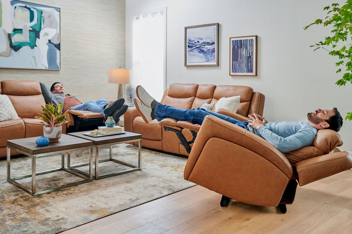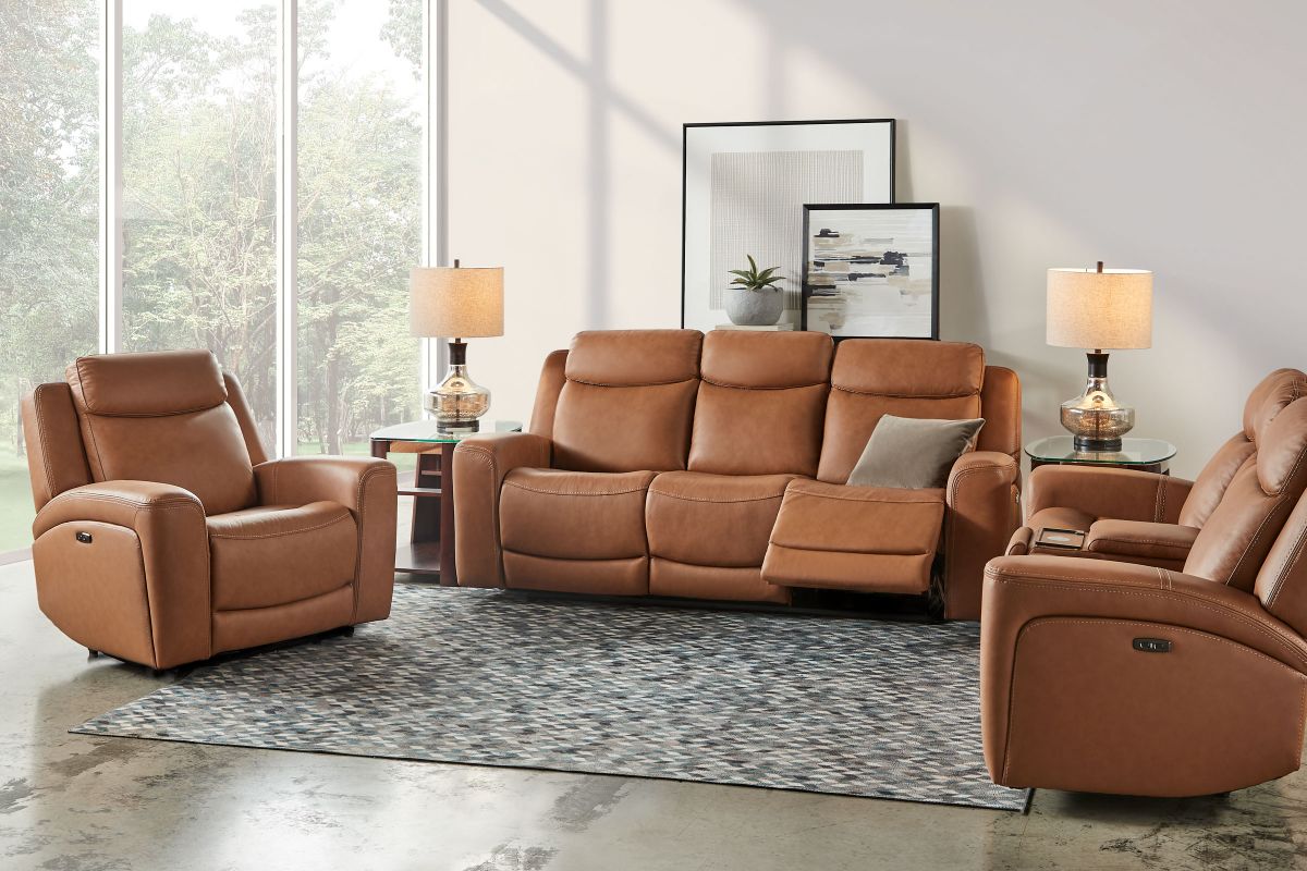 Bring home the perfect blend of sleek design and luxurious comfort with the Knox leather collection. Upholstered in rich, caramel-toned leather, it features a clean, tailored silhouette with gently curved lines and supportive high back cushions. The subtly flared arms and detailed topstitching add refined style, while plush, deep seats invite you to relax. Designed with functionality in mind, both end seats recline smoothly, making it ideal for lounging, movie nights, or everyday comfort. With its timeless look and premium materials, this sofa is a stylish and durable centerpiece for any contemporary living space.