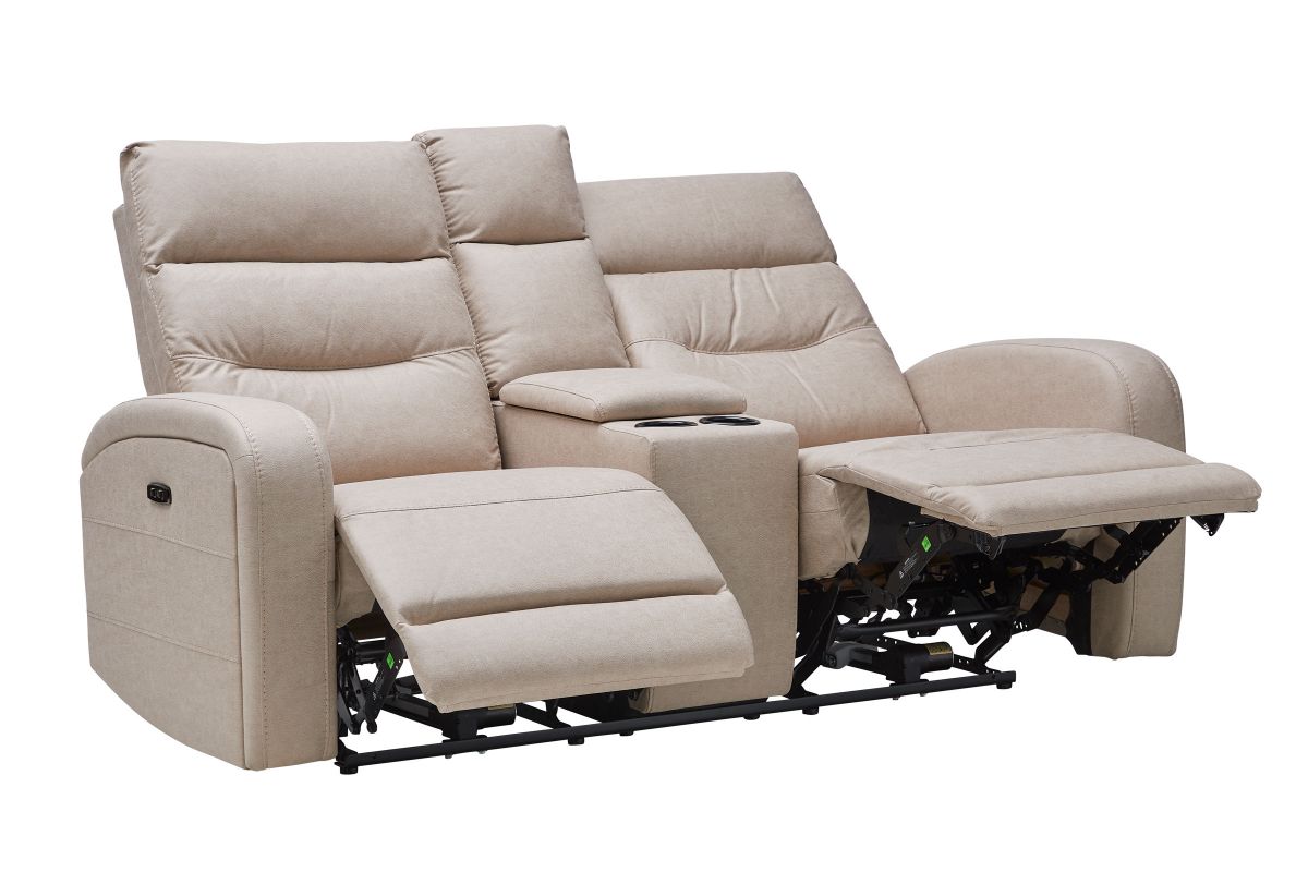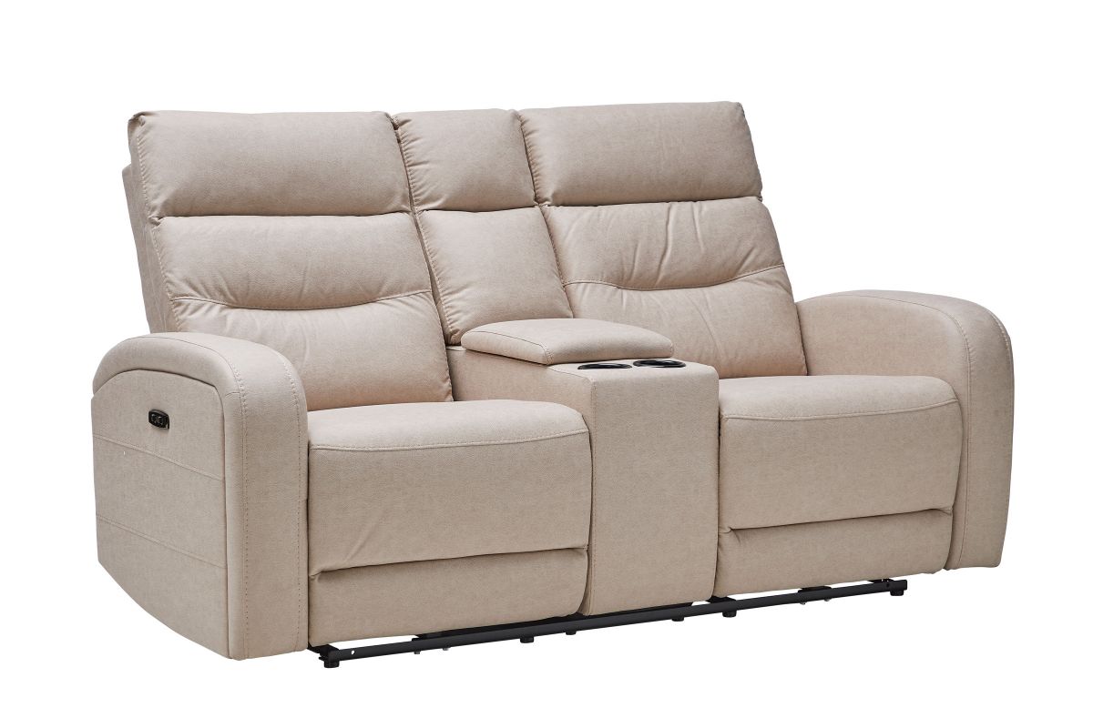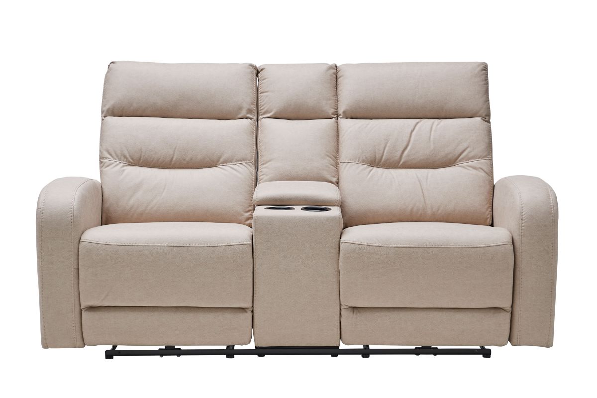Upholstered in beige fabric, the Virgo reclining console loveseat has padded back cushions and plush seating for your comfort. Recliners on each end easily extend, allowing you to sit back and relax. Each headrest is ultra-plush, providing optimum neck and head support as you read, watch TV, or relax.