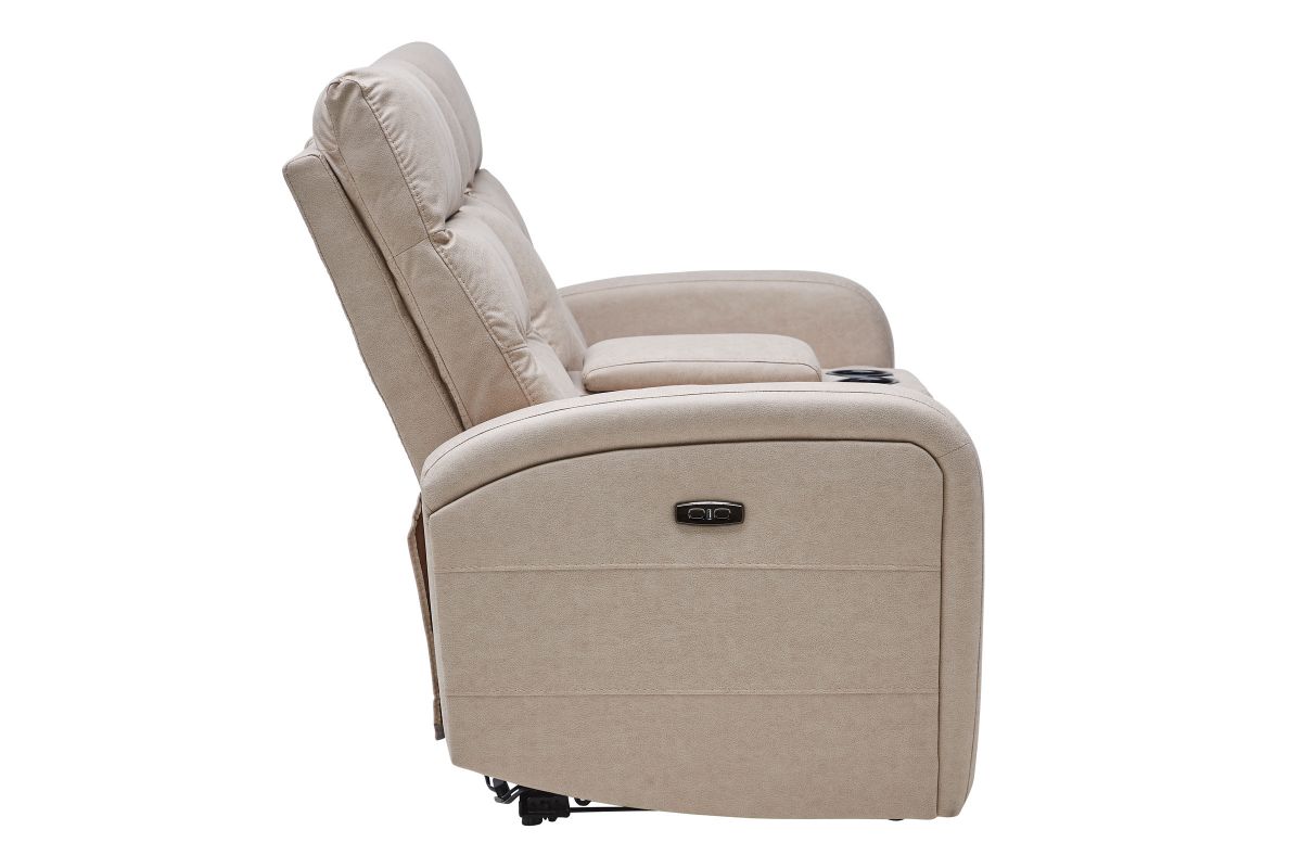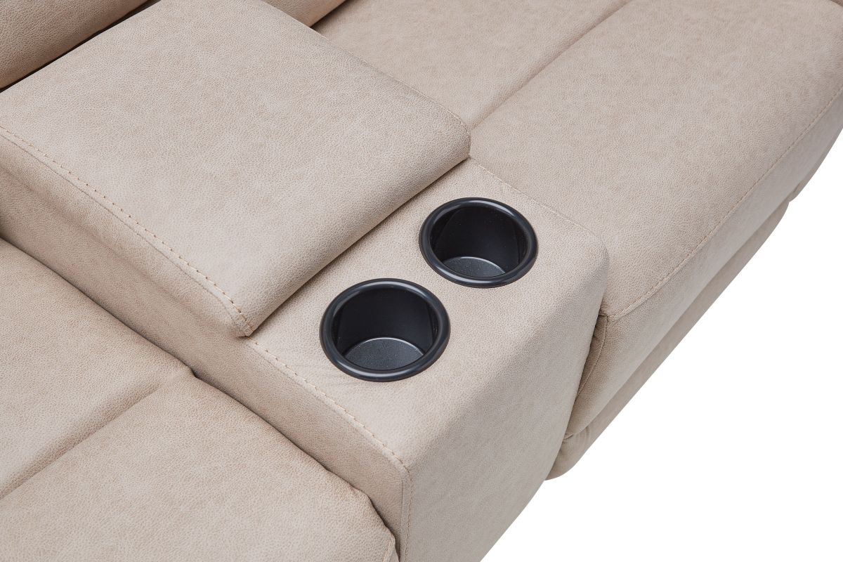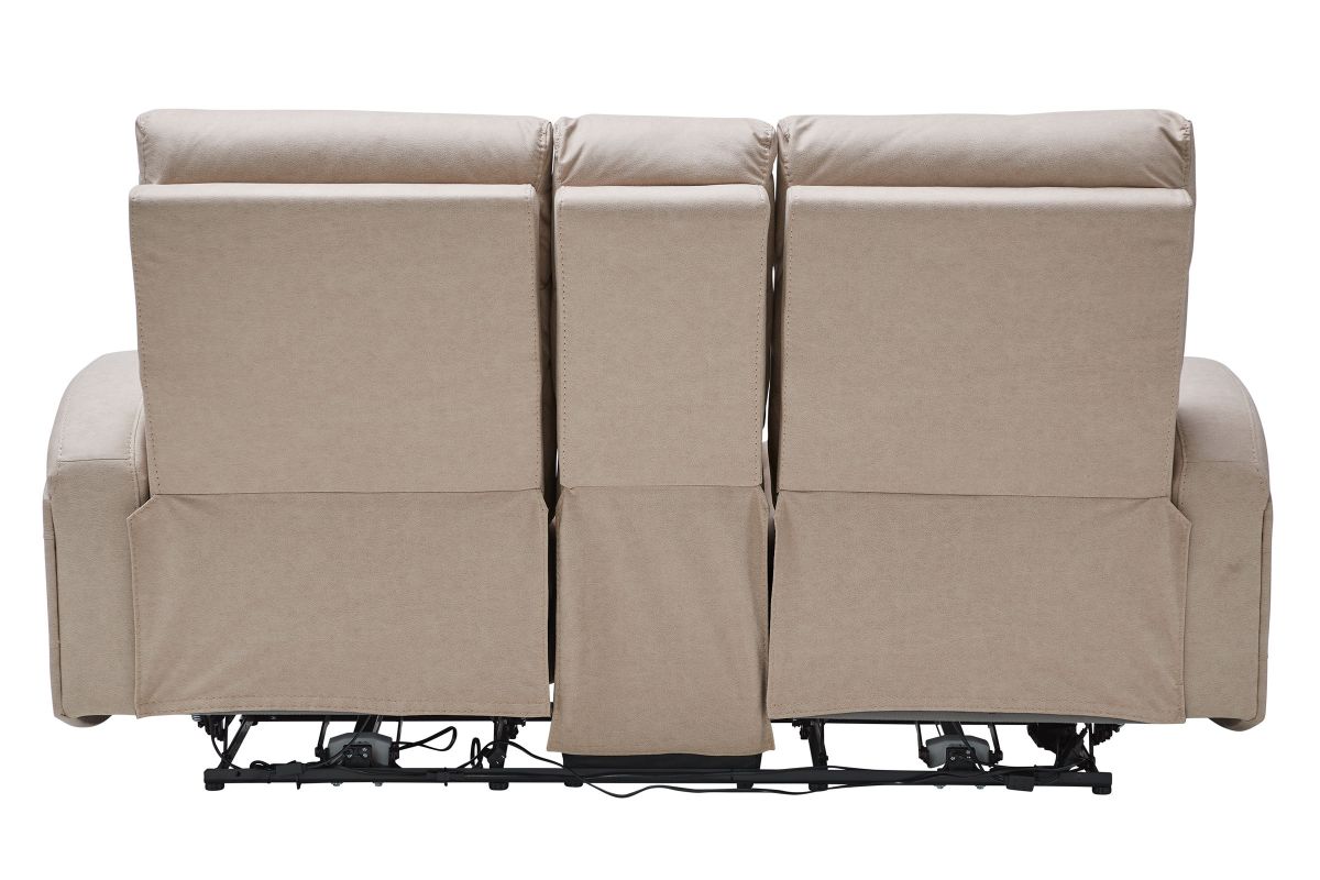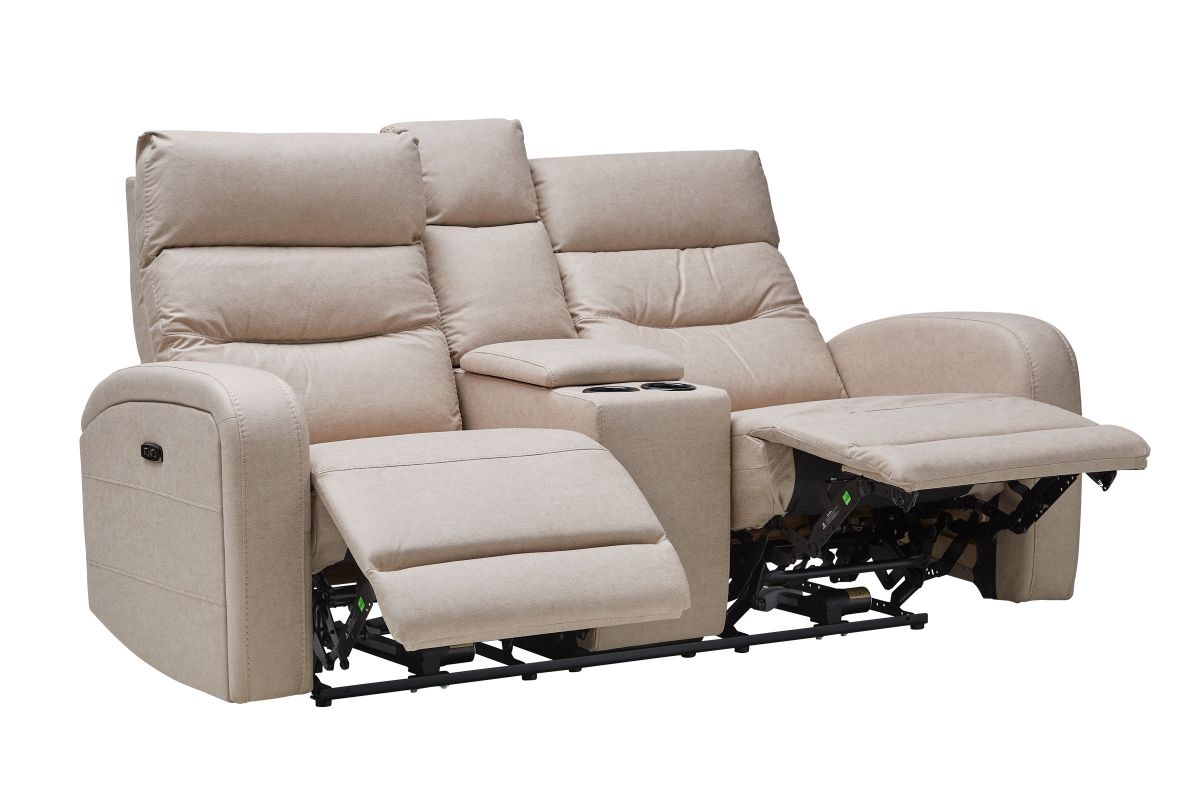 Upholstered in beige fabric, the Virgo reclining console loveseat has padded back cushions and plush seating for your comfort. Recliners on each end easily extend, allowing you to sit back and relax. Each headrest is ultra-plush, providing optimum neck and head support as you read, watch TV, or relax.