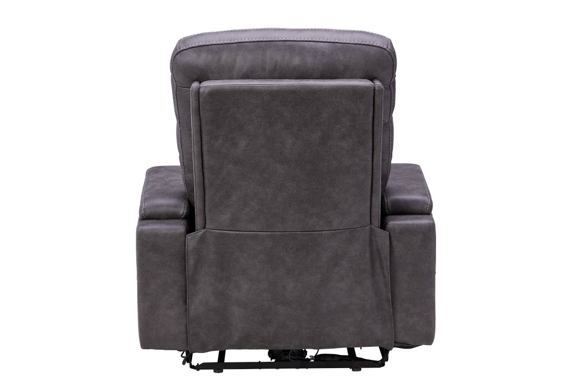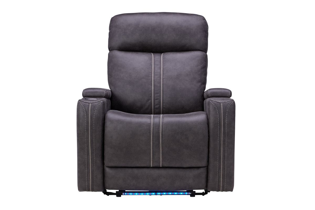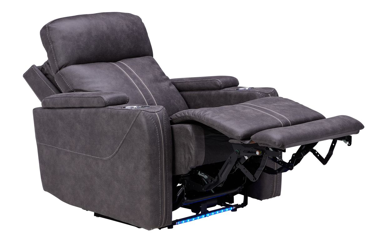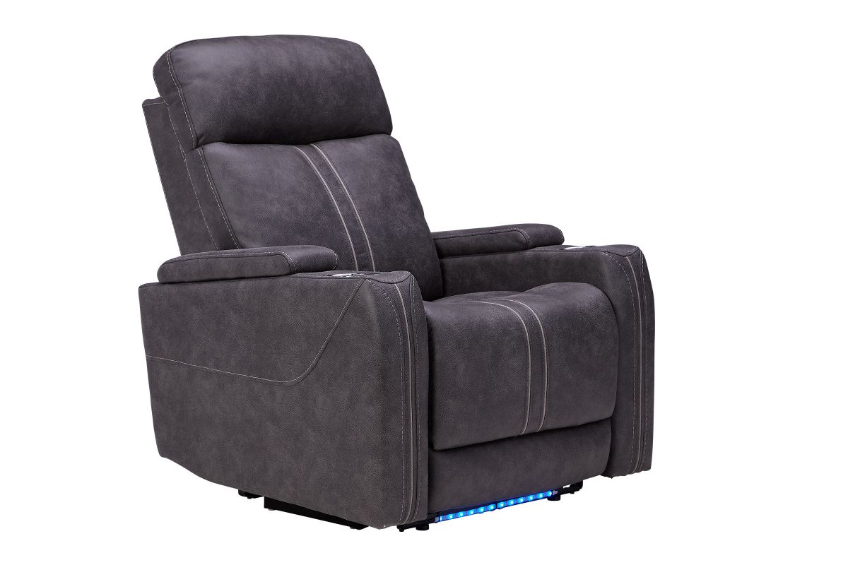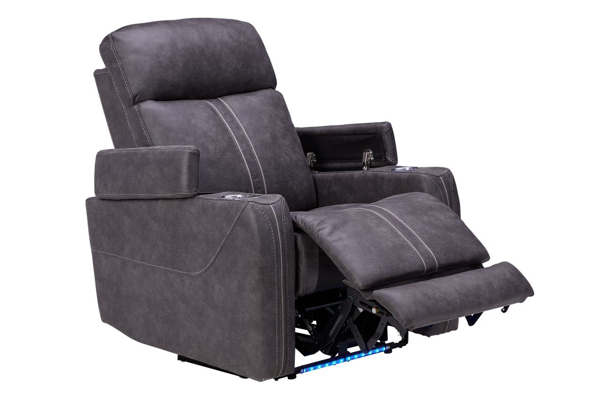 Stylish, innovative and comfortable, the Trinity Triple Power Reclining Theater Chair has it all. Upholstered in a grey faux leather, the soft hand of this fabric will entice you to relax for hours. Equipped with fully loaded hidden storage armrests, and light up cupholders this recliner is both innovative and comfortable. The luxury vehicle inspired backrest adds visual appeal to this bold and handsome recliner. Add the Trinity Triple Power Reclining Theater Chair to your home for the theater-worthy living space that you have been longing for.