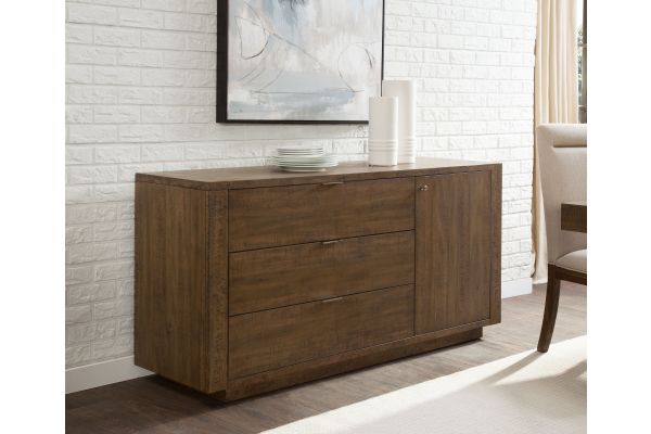 - Sideboard has three deep drawers and one door with metal side drawer glides for smooth operation