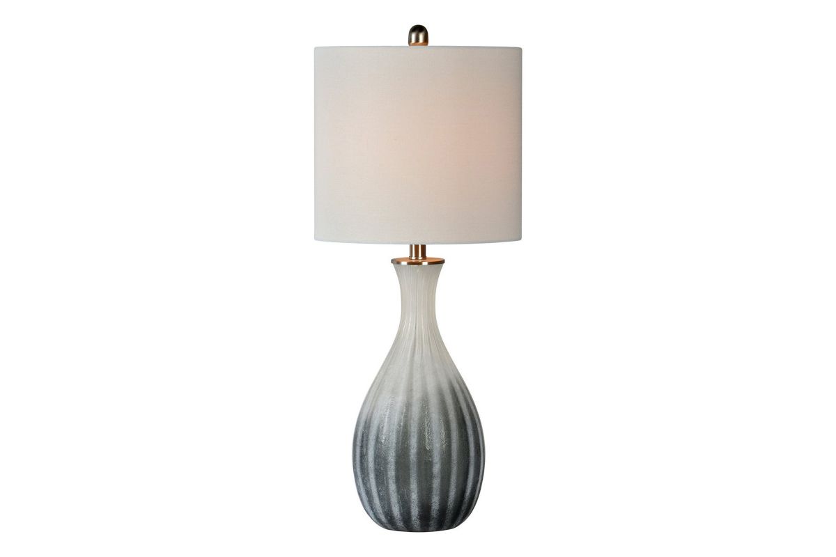 The Presley Table Lamp features a grey and white finish on a glass body with a hardback shade. This table lamp is transitional so it can fit with any style in any room!