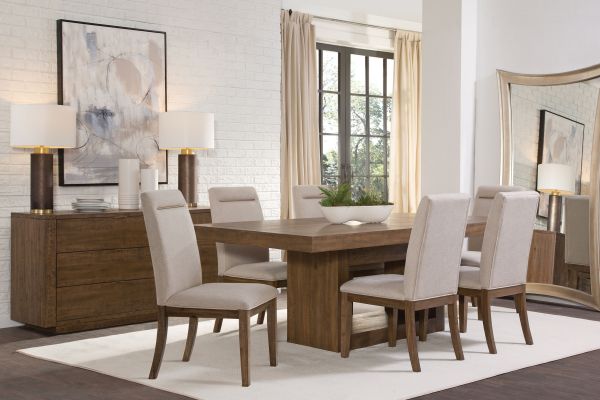 Sophisticated and elegant but with a casual accent, the Manhattan Dining Collection is built to shine in any environment.A distressed toffee finish blends with a sophisticated modern profile in a relaxed style-blending design marked by clean, crisp lines. The Manhattan Table comes with an 18-inch leaf that extends the table to 88 inches to seat up to eight comfortably and marries beautifully with the fully upholstered Parsons Chairs in a tightly tailored canvas cover with a brass accent, mixing casual and formal designs in a relaxed but elegant design. Pair these beauties with the Sideboard with a tasteful hardware treatment for an ultra-clean presentation that also offers plenty of hidden storage. Seat all of your family and friends in a comfortable but elegant dining presentation with the Manhattan Dining Collection.