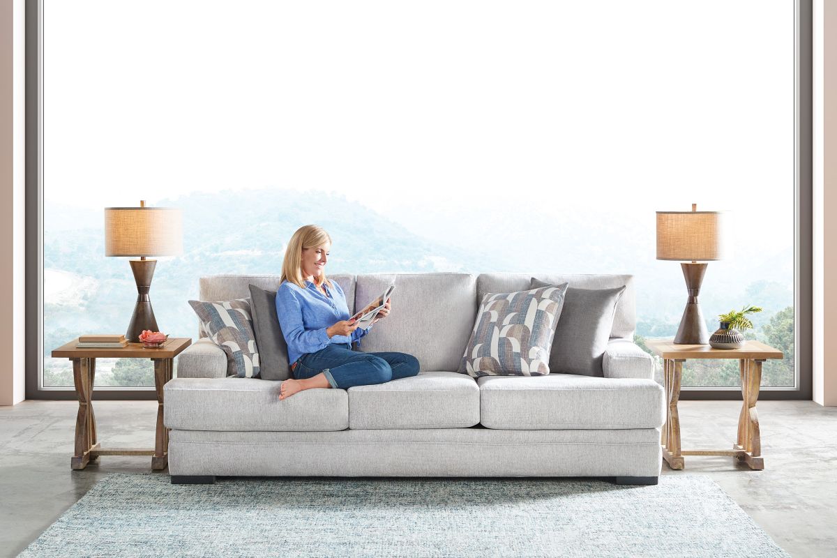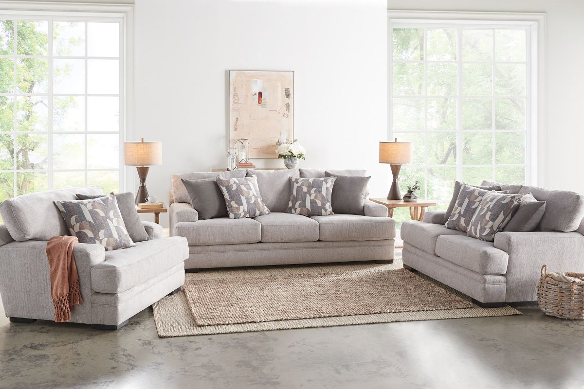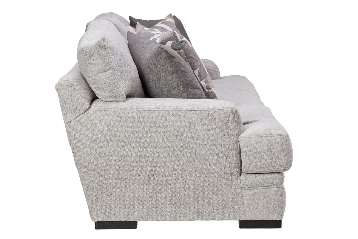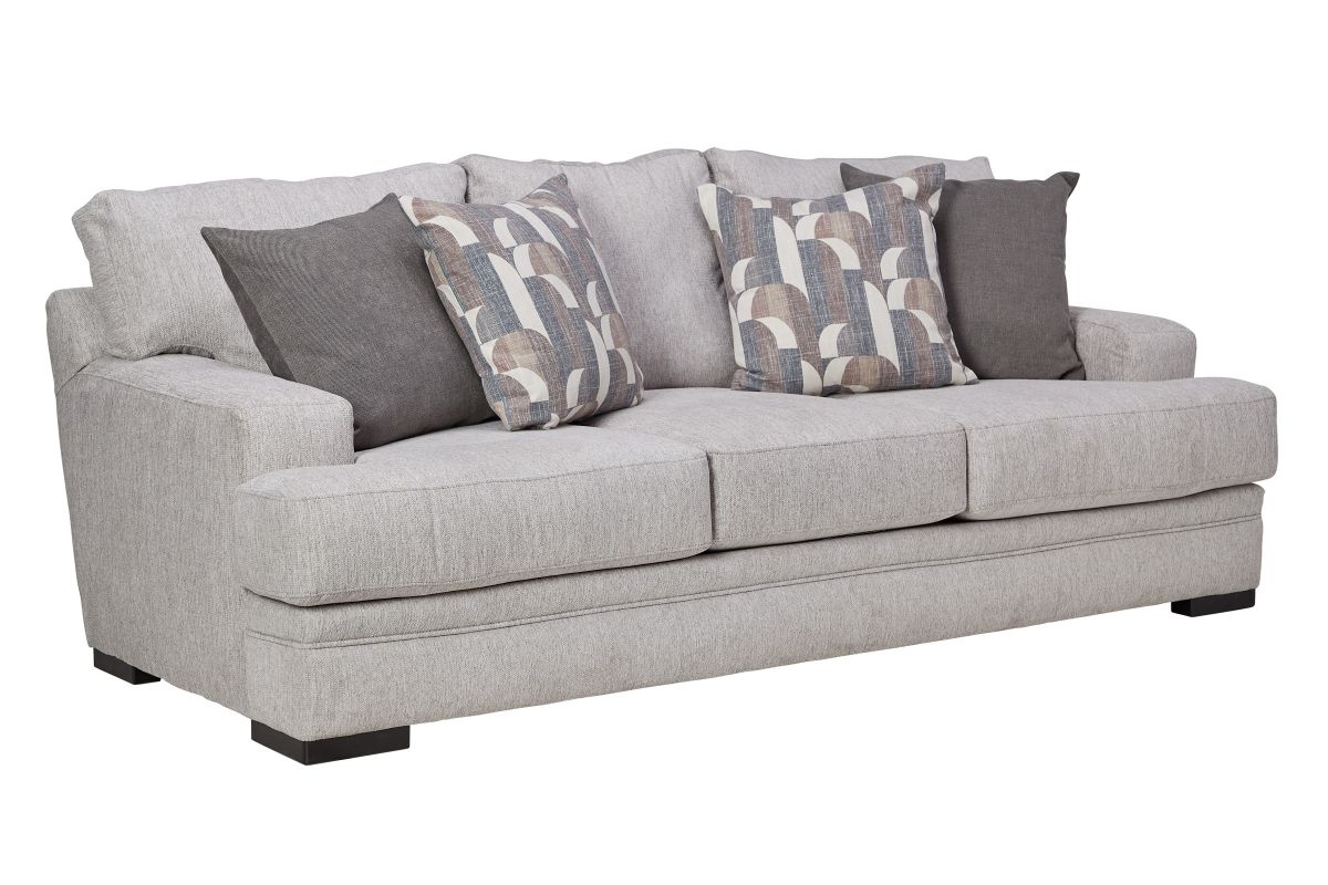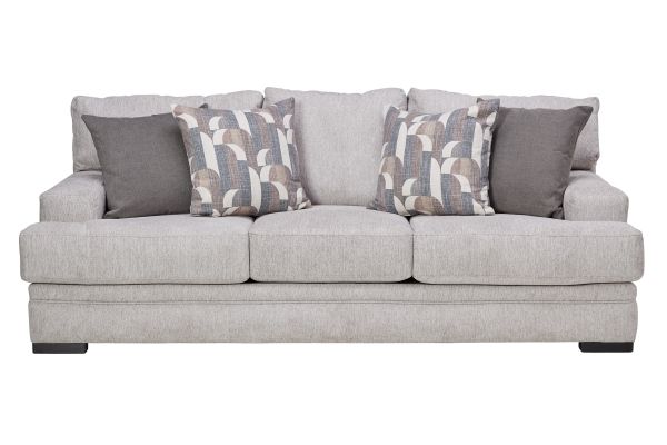 The Huron Sofa brings fresh energy to your space with its clean lines, deep seating, and substantial track arms that speak to modern comfort. Upholstered in a soft, textured fabric, its neutral tone makes it a versatile anchor for any room—while low-profile block feet in a warm wood finish ground the silhouette with a relaxed, contemporary feel. Included throw pillows feature rich textures and geometric patterns, adding visual interest and a curated touch. Whether you're lounging solo or entertaining guests, the Huron blends plush comfort with statement-making style.