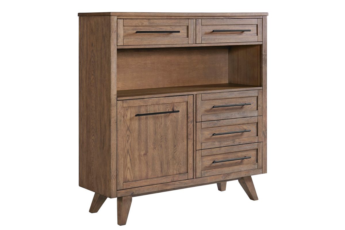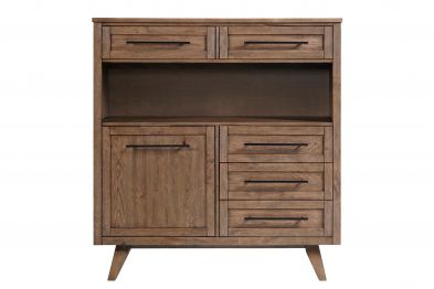 The Cheswick Server is constructed with wire brushed oak veneer and offered in a Weathered Chestnut finish. Unique features of this collection are the patterned veneer sideboard tops, and large bar pull hardware with a dark bronze finish.