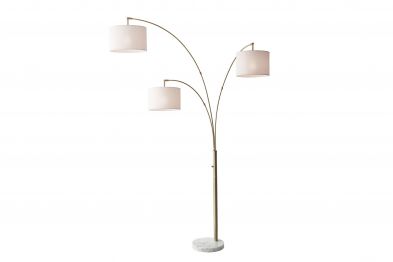 A smart and stylish way to light up a seating area, the Bowery 3-Arm Arc Lamp provides overhead lighting that can be controlled with three adjustable shade arms. Aside from functional assets, an antique brass finish is paired with a white marble base to display striking style. Three 60 Watt bulbs shines beautifully through off-white textured fabric shades. A rotary switch located on the pole controls the light at 4 settings: 1 light on, 2 lights on, 3 lights on, off. This lamp has a clear cord and is smart outlet compatible
