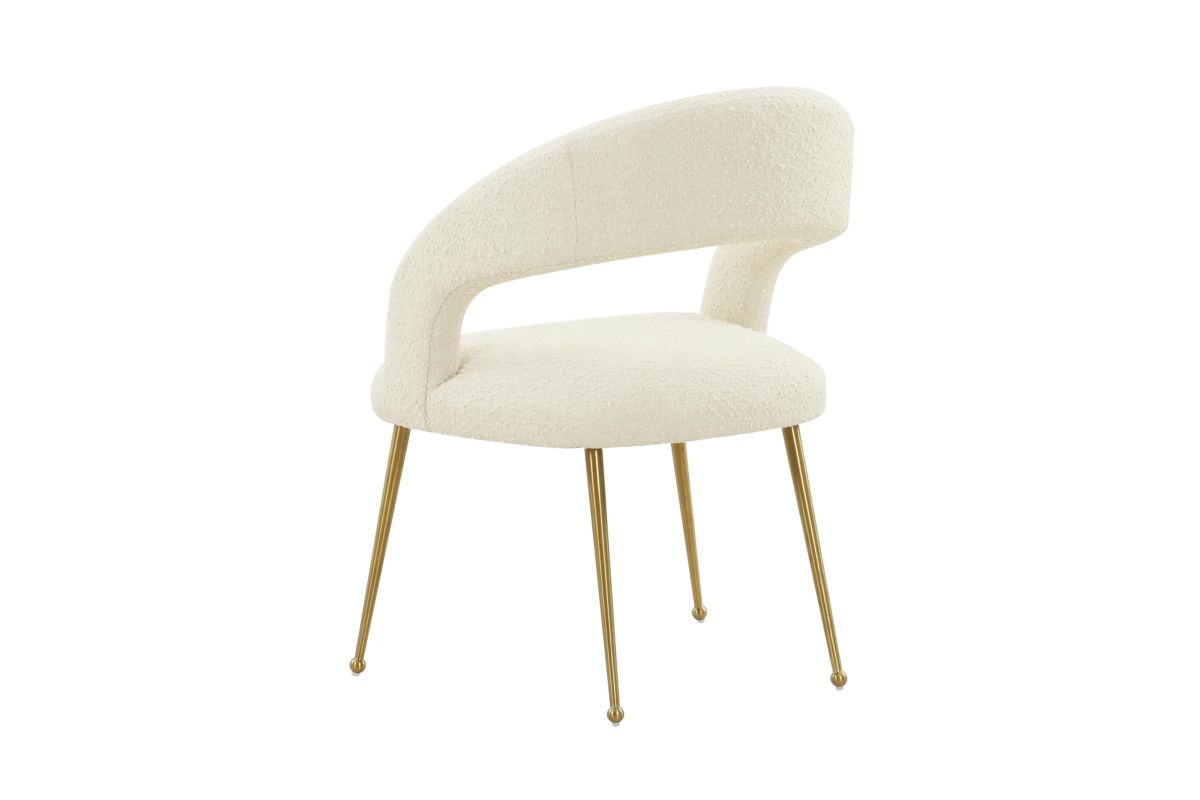 Mid Century Modern meets Hollywood Glam to form the striking Rocco dining chair. Boasting lavishly soft boucle upholstery and stylish stainless steel legs, this versatile chair will enhance any dining area. Available in cream boucle and several velvet color options, the Rocco compliments our Maxim dining table beautifully.