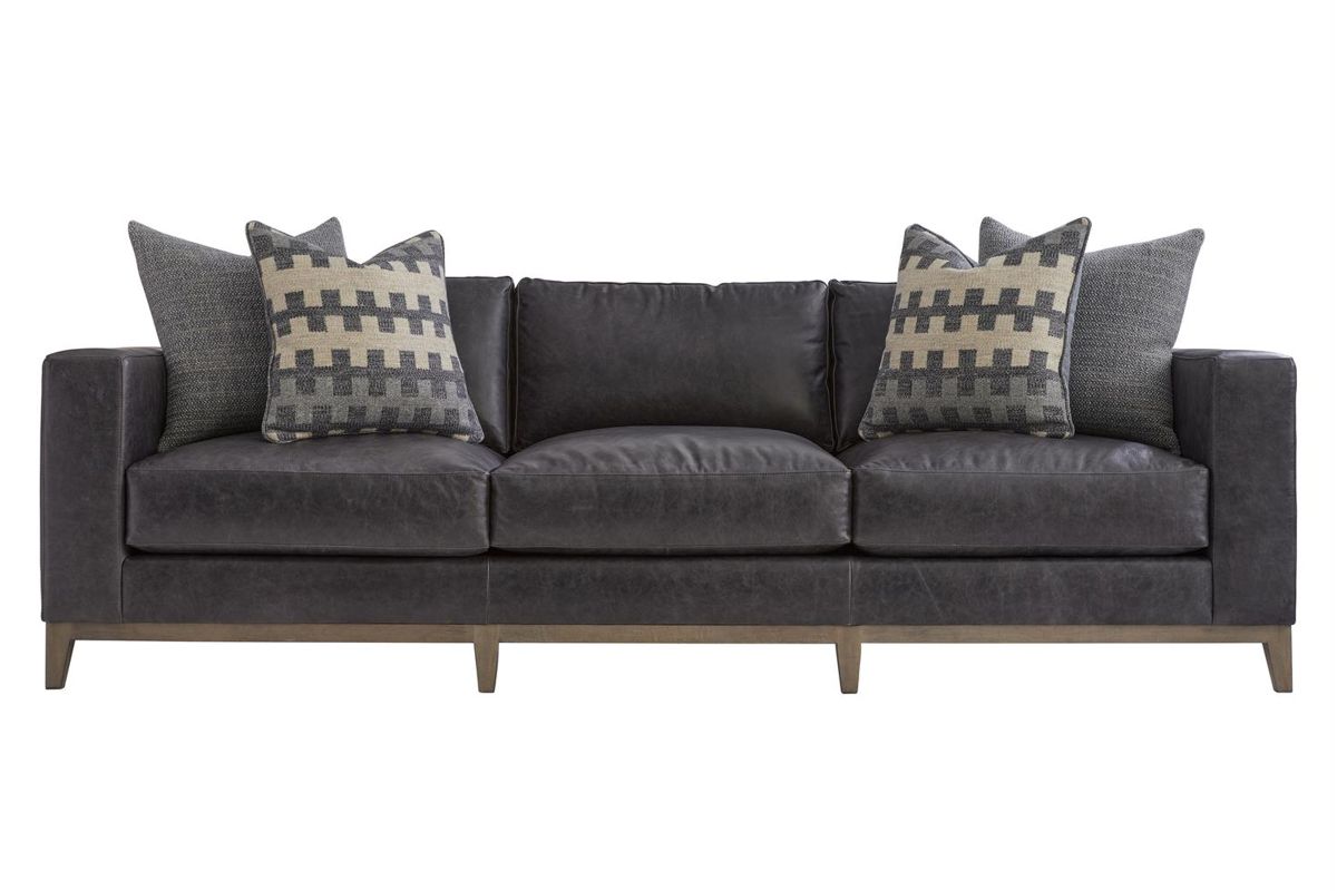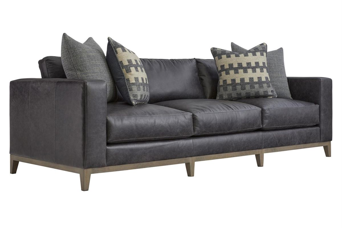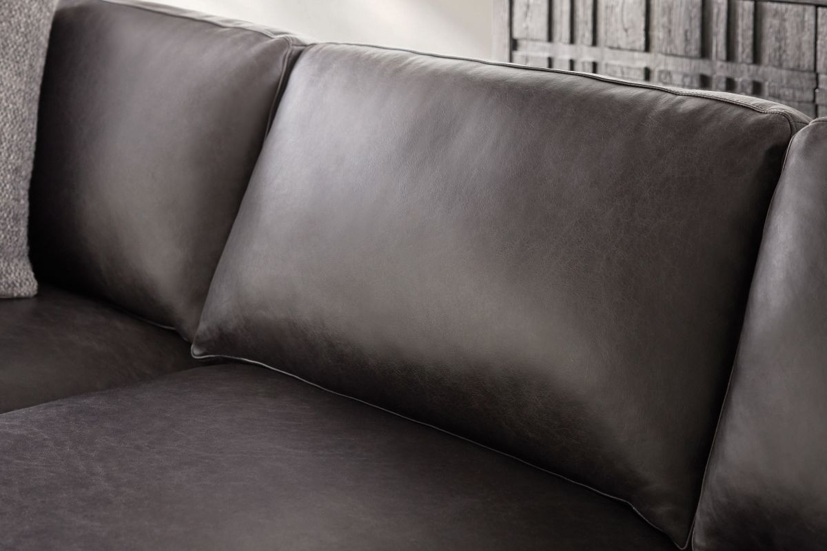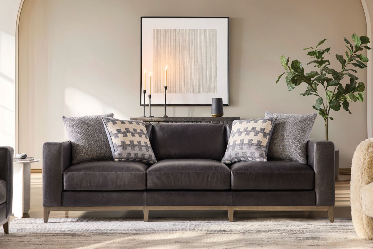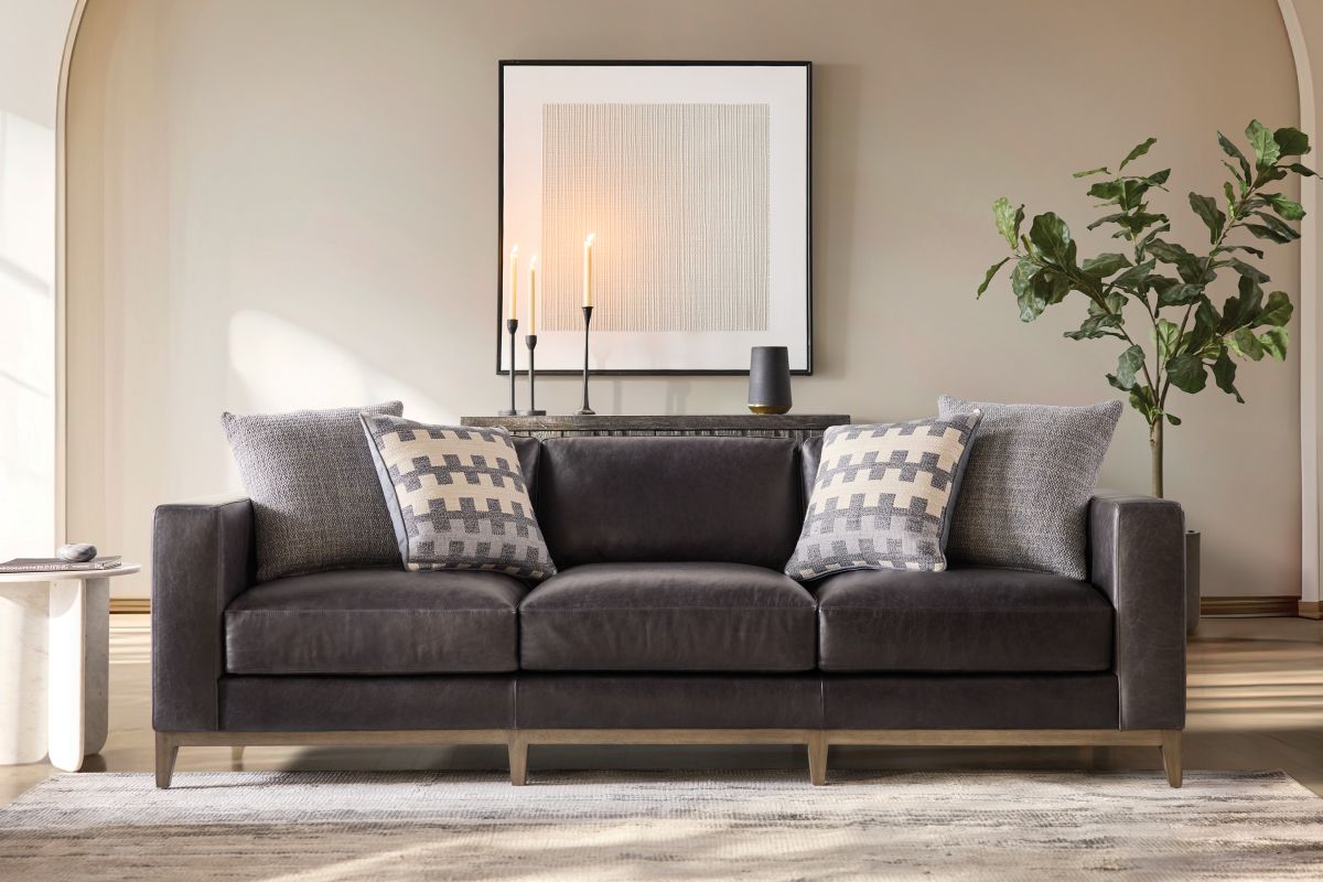 Freshly updated styling the Hugo leather sofa is a great addition to your family room. Upholstered in a rich contemporary charcoal gray leather and includes 4 plush blend down toss pillows. Luxurious spring-down seating provides long-lasting comfort.