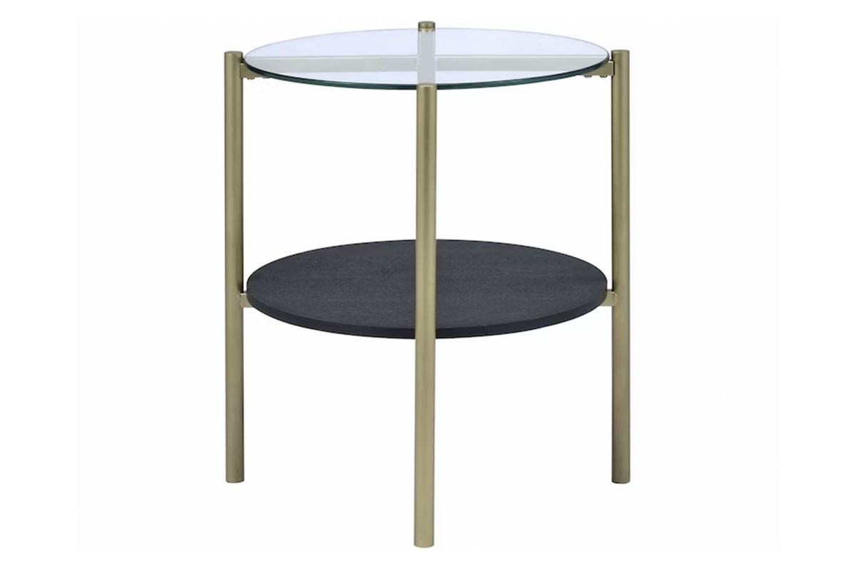 This three piece set includes a coffee table and two end tables. The table tops are tempered glass, ensuring stability and also a touch of chic. The table legs are powder coated in a gold metallic, which pairs beautifully with the black shelf in the middle. The shelf in the middle of the tables is ideal for storing away books and magazines, or to display your favorite decor. Add this trio to your home today for a look thats uniquely you!