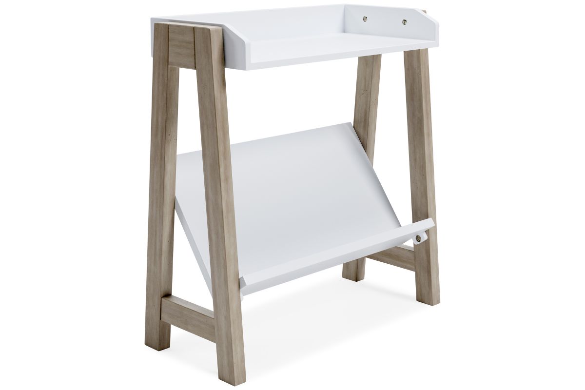 Whether for storage or display, this stylish small bookcase provides the perfect place to prop their ever-expanding book collection. The unique angled lower shelf and gallery rail top in white charmingly contrast with the light tan frame, creating a versatile piece ideal for small spaces.