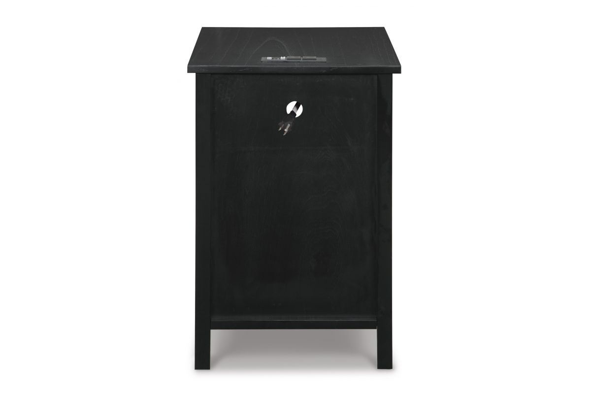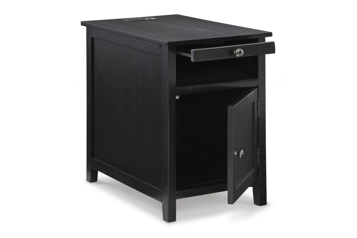 Add big character to a small space with this chairside end table. With its compact size and strong silhouette, it can go anywhere and blend easily into the decor. Less is so much more with the Shaker-inspired design and black wood tone finish. Loaded with form and function, this end table displays accent pieces and stores essentials securely while keeping devices powered up.