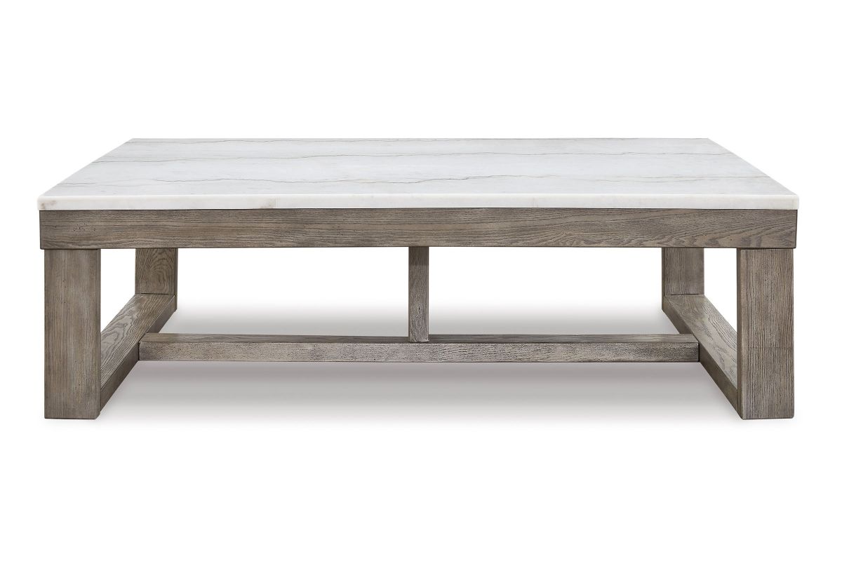 This coffee table is simple in design but big on style. Finished with a trend-right grayish brown wood tone, its bold, blocky profile and natural marble top are timeless classic choices that work so well with large sectional family room settings. Adding to its beauty, the marble top's color variations, fissures, mineral deposits and veining are naturally formed and are not defects.