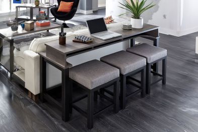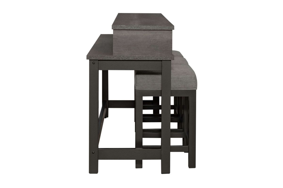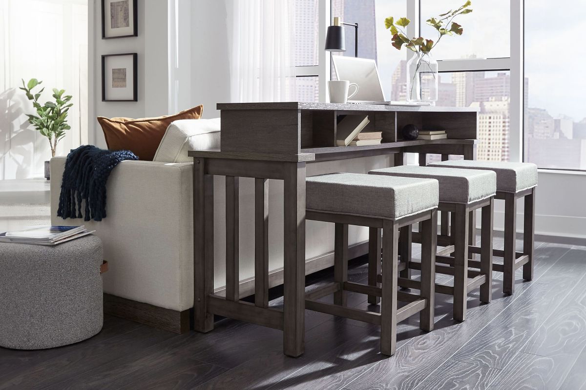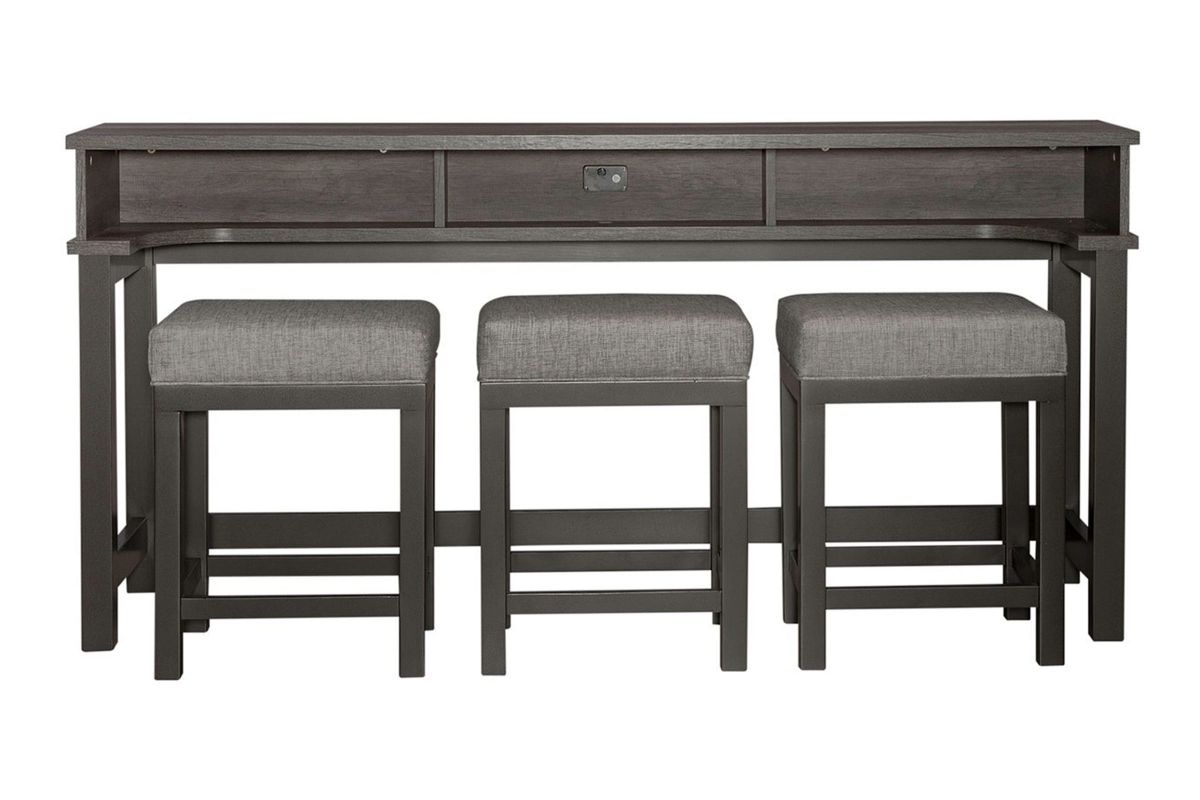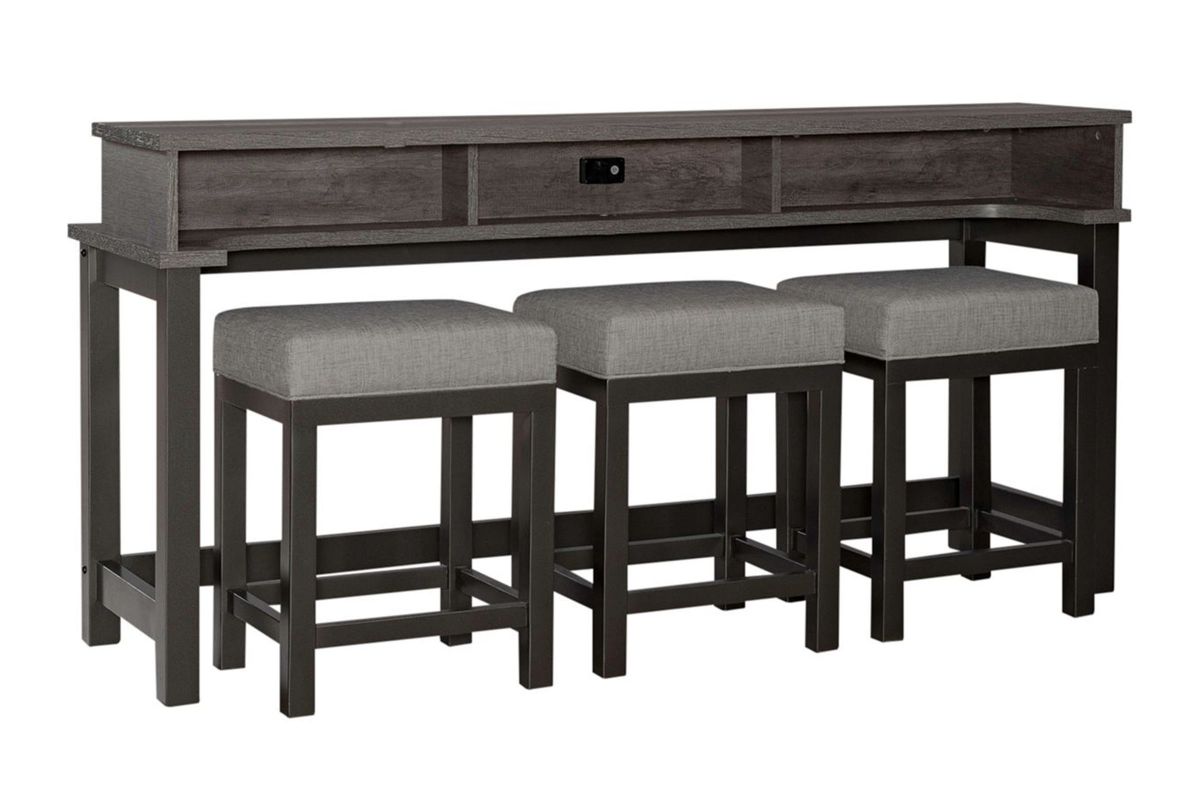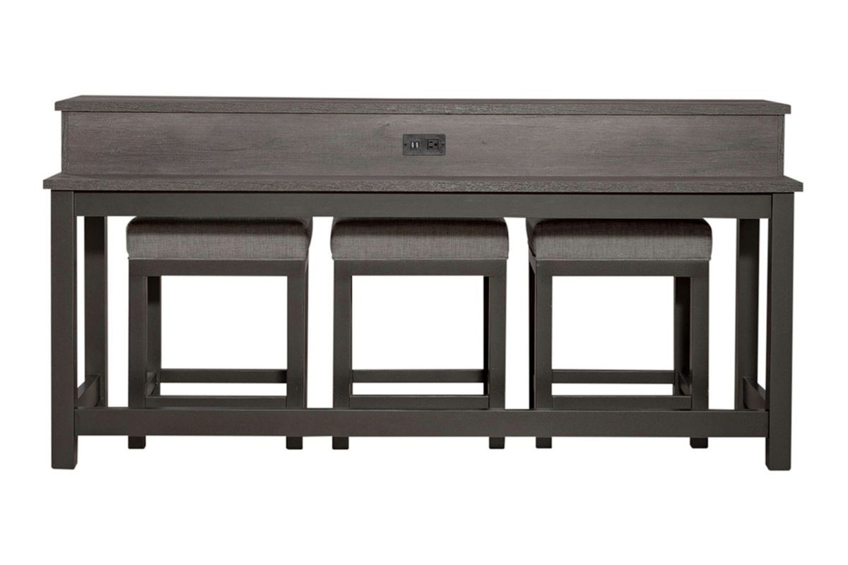 The Tanner Creek is both practical and stylish. Crafted of melamine and a rubberwood solid frame in a Greystone finish. Melamine provides protection against scratches from normal wear and tear. Features three storage cubbies under top, one electrical outlet and two USB ports for easy access charging and square block legs with a slat end panel design. Console stools offer cushioned upholstered seats for added comfort. Perfect for behind your sofa or in a kitchen nook. Kit consists of one console bar table and three console stools.