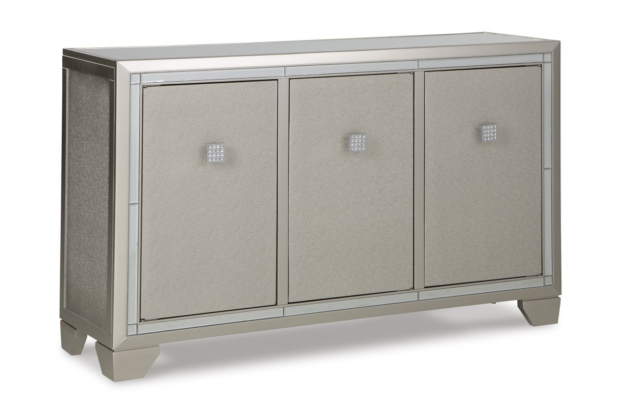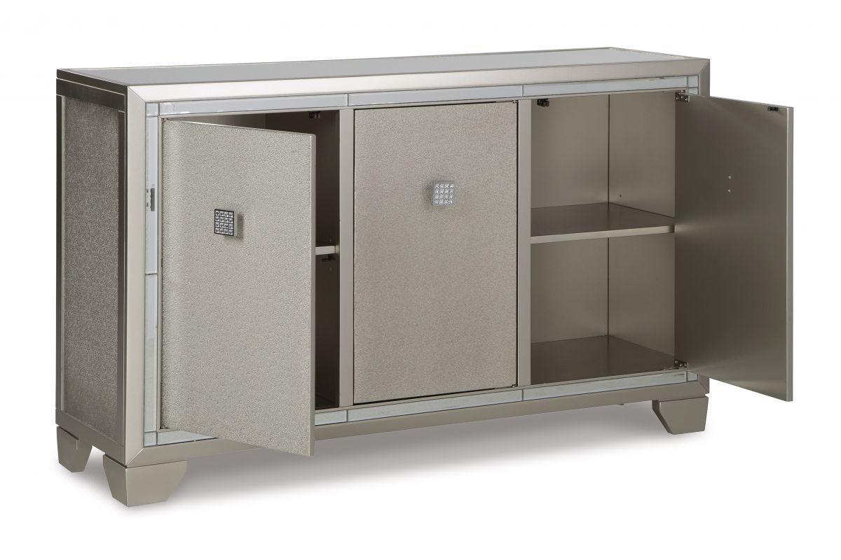 Reflect your love for contemporary style with this accent cabinet. It features a mirrored top and beveled mirror accents, adding both light and a touch of glam to your space. Decorated with faux crystal and chrome-tone pulls, the textured silvertone door fronts open to reveal adjustable shelving to meet all your storage needs.