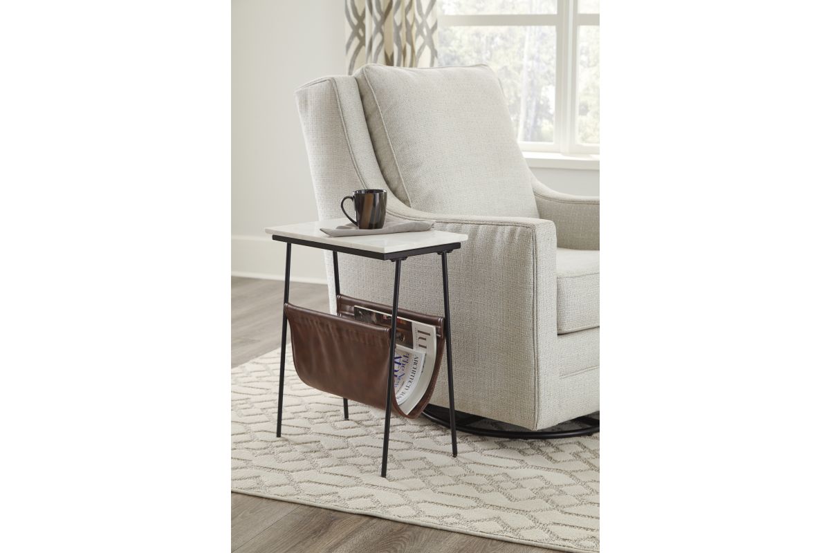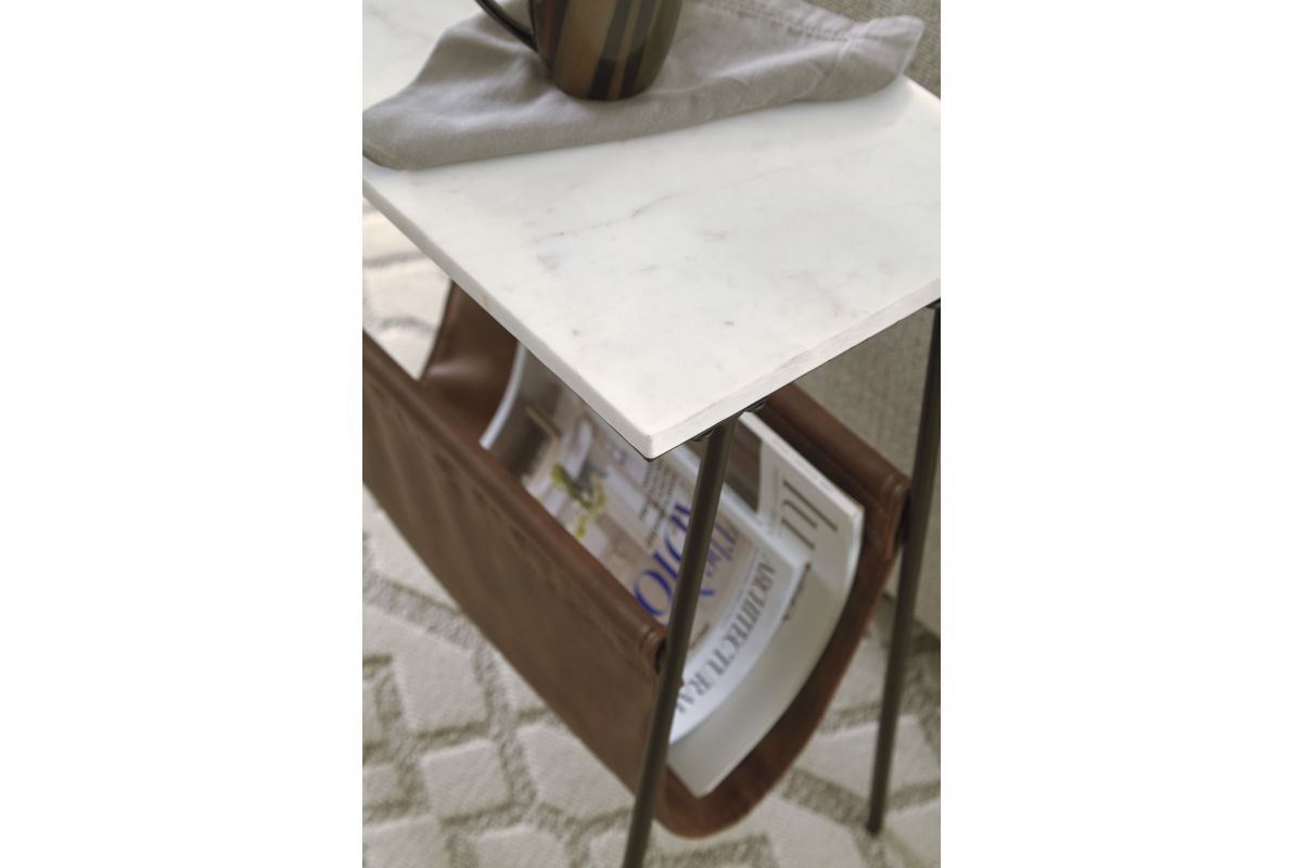 With its mixed media design, this accent table with magazine holder is what's new and what's you. Fusion of black metal, white marble and brown faux leather creates a contemporary aesthetic that's the genuine article.