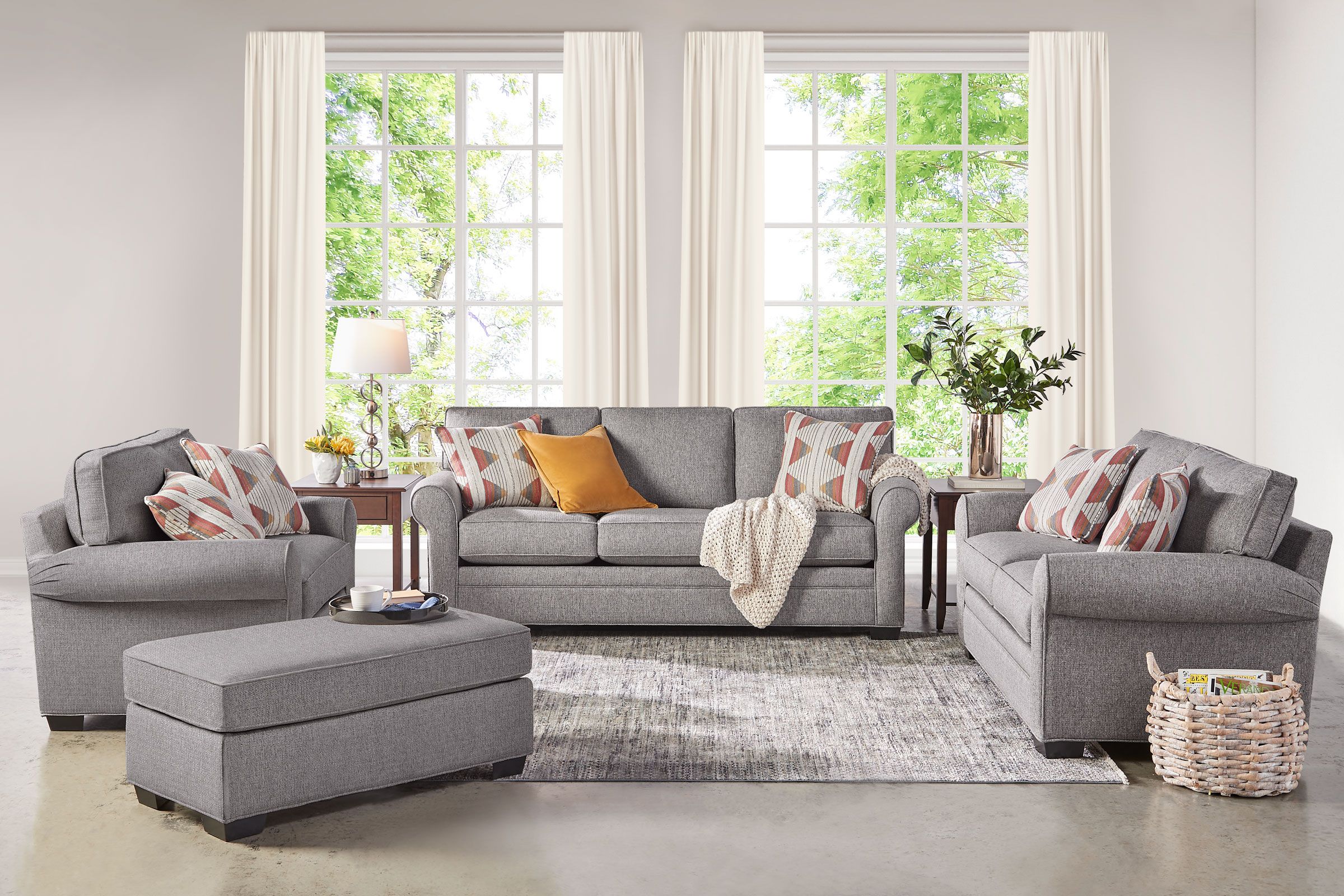 Update your living room with the enticing Sadie Collection. This collection features textured performance fabric in an on-trend gray color that is stain-resistant and easily cleanable. Additional fashionable features include loose reversible seat and back cushions with double welted boxed borders and comfortable padded rolled arms and wood block legs. Decorative matching toss pillows keep the look understated and sophisticated. 100% Polypropylene.