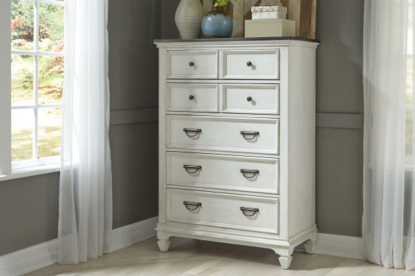 Create a classic cottage style with the Higgins 5 drawer chest. The two-toned wire brushed white finish with charcoal top adds a taste of vintage, allowing this piece to work from the mountains to an industrial loft. The charcoal top is accented by planks while the white base is highlighted by bead molding and antique pewter hardware. Crafted of Pine solids & Veneers with cathedral white oak tops, his piece features fully stained interior drawers, full extension drawer glides for easy access to storage, felt lined top drawer, and is anchored by tapered feet. Style uncompromised with storage abound, enjoy the ample drawer storage, each equipped with bottom case dust proofing.