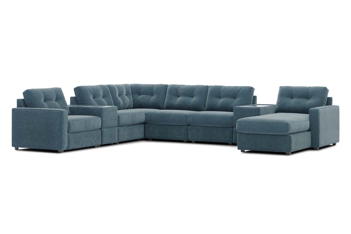 Discover the limitless possibilities of the ModularOne sectional, thoughtfully designed with comfort and flexibility in mind. This customizable seating solution features individual pieces that can be reconfigured to the shape you need. Game days, movie nights, sleepovers, and everyday relaxation are all better when the seating arrangement you want is always right at your fingertips. Each individual piece is upholstered on all sides in soft, chenille fabric that includes Repreve yarn, made with recycled plastic bottles. The open seating includes a chaise and has welted track arms, top-stitched seat cushions and button-tufted back cushions for an elegant silhouette. Media consoles provide hidden storage, USB charging ports, wireless charging, Bluetooth speakers, and double as side tables with sleek acrylic tops.