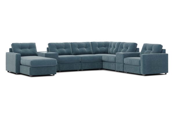 Discover the limitless possibilities of the ModularOne sectional, thoughtfully designed with comfort and flexibility in mind. This customizable seating solution features individual pieces that can be reconfigured to the shape you need. Game days, movie nights, sleepovers, and everyday relaxation are all better when the seating arrangement you want is always right at your fingertips. Each individual piece is upholstered on all sides in soft, chenille fabric that includes Repreve yarn, made with recycled plastic bottles. The open seating includes a chaise and has welted track arms, top-stitched seat cushions and button-tufted back cushions for an elegant silhouette. Media consoles provide hidden storage, USB charging ports, wireless charging, Bluetooth speakers, and double as side tables with sleek acrylic tops.
