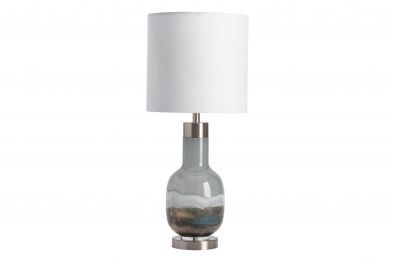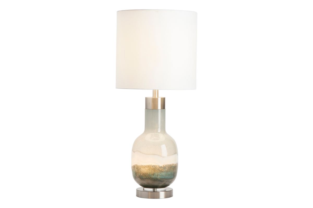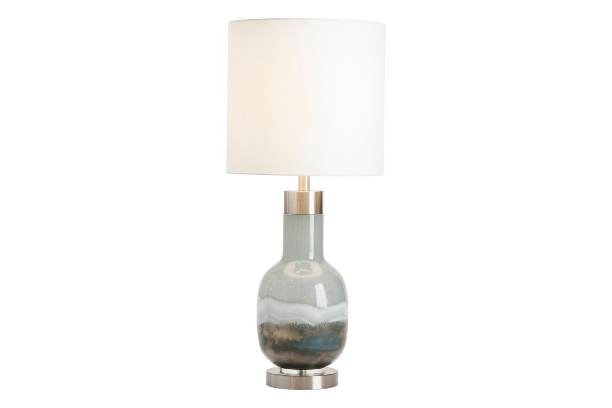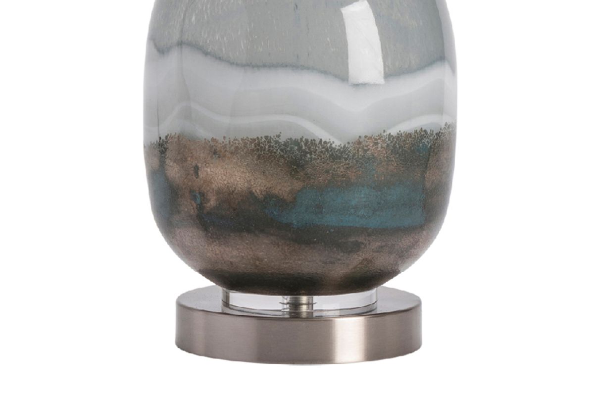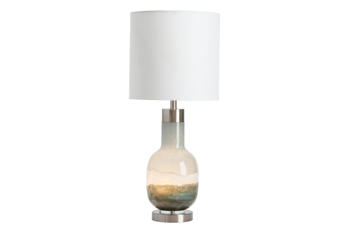 The Saluti Table Lamp resembles layers of multi-colored sand in a bottle. The body is made of blown glass with brushed steel accents. An ombre design of blue and gray gives it a subtle, coastal feel. A white linen cylinder shade completes this transitional accent piece.