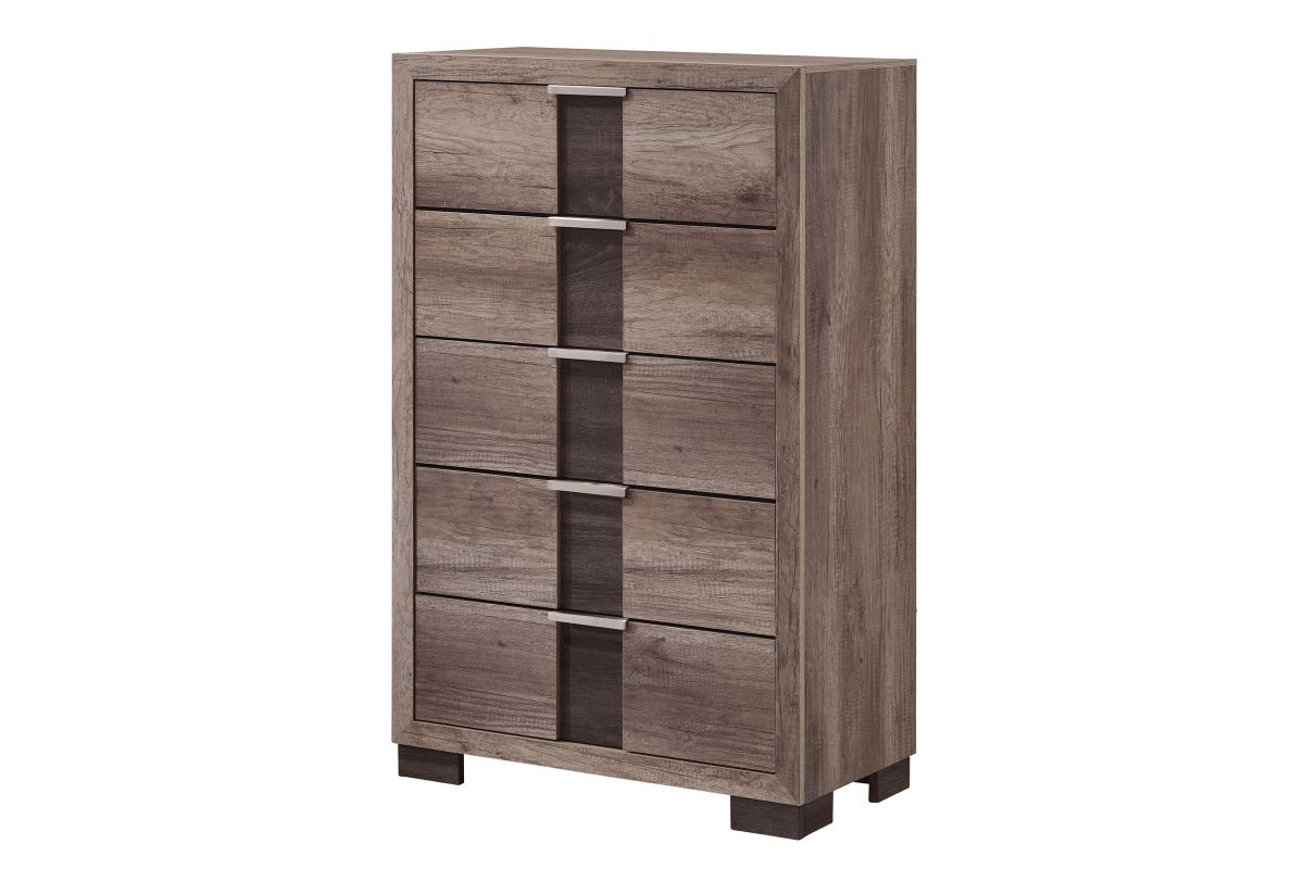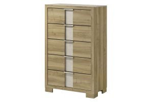 This 5-drawer bedroom chest is a stylish and functional addition to any bedroom decor. It features a sleek and modern grey and black finish, complemented by elegant metal drawer pulls that add a touch of sophistication. With five spacious drawers, there's plenty of room for all your clothing and accessories. The sturdy construction and high-quality materials ensure that this chest is built to last. It's perfect for adding extra storage space to your bedroom and its clean and simple design will blend seamlessly with a wide range of decor styles. Whether you're looking for a standalone piece or to complete a full bedroom set, this 5-drawer bedroom chest is a practical and stylish choice.