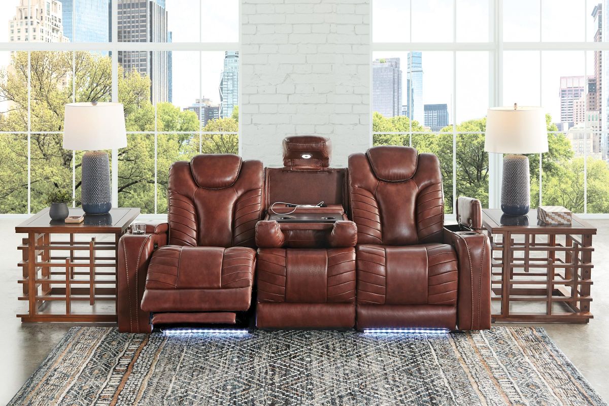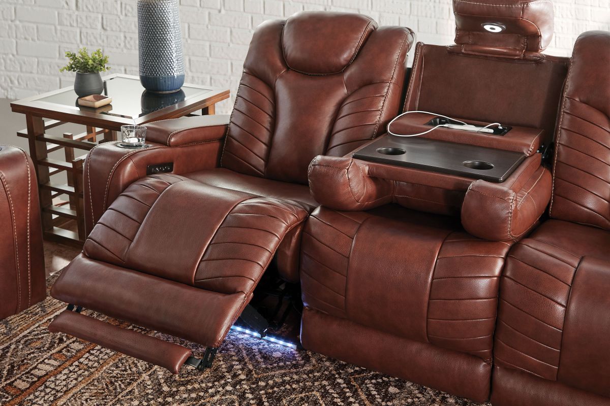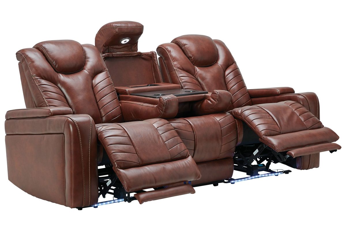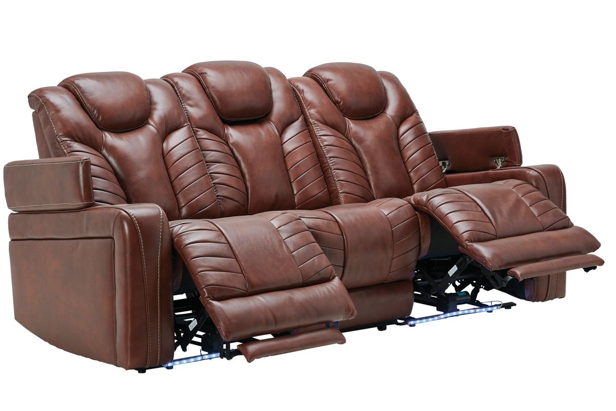 Gatherings call for a fun, relaxing place to get together and you'll find just that in the Viper Dual Power Leather Reclining Sofa. With its streamlined modern look, brown leather upholstery, stylish tailoring and LED lighting, you can see why the Viper is a crowd favorite. When it comes to comfort, you'll love the two reclining bucket seats with adjustable power headrests that deliver personalized angles for TV viewing. It's convenient too—sporting a center drop down table with docking station, cup holders, flip up padded armrests with hidden storage underneath, and power buttons with USB ports.