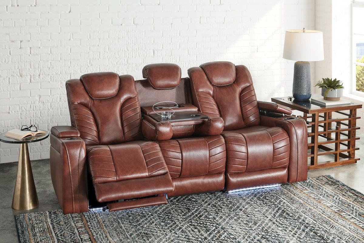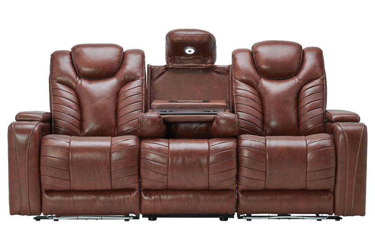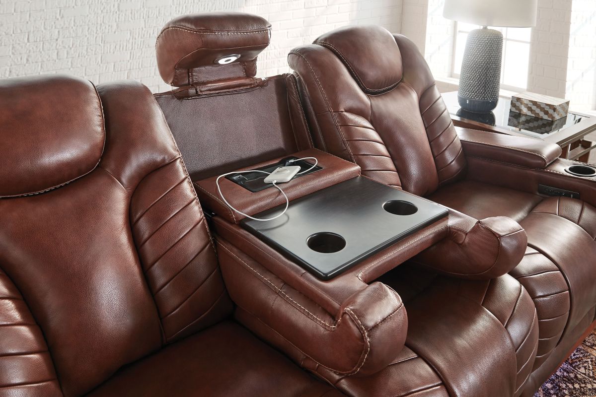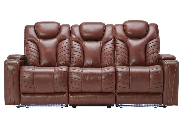 Gatherings call for a fun, relaxing place to get together and you'll find just that in the Viper Dual Power Leather Reclining Sofa. With its streamlined modern look, brown leather upholstery, stylish tailoring and LED lighting, you can see why the Viper is a crowd favorite. When it comes to comfort, you'll love the two reclining bucket seats with adjustable power headrests that deliver personalized angles for TV viewing. It's convenient too—sporting a center drop down table with docking station, cup holders, flip up padded armrests with hidden storage underneath, and power buttons with USB ports.