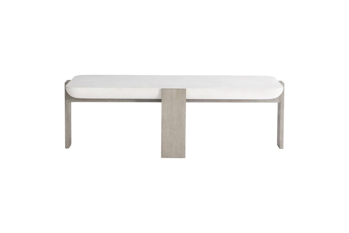 A faux concrete top in a Sand Grey finish is cradled in a wood frame on the Gooding cocktail table. The basin shaped top is supported by wooden legs that flow to the top. The exposed wood is finished in Flint for a modern organic style.