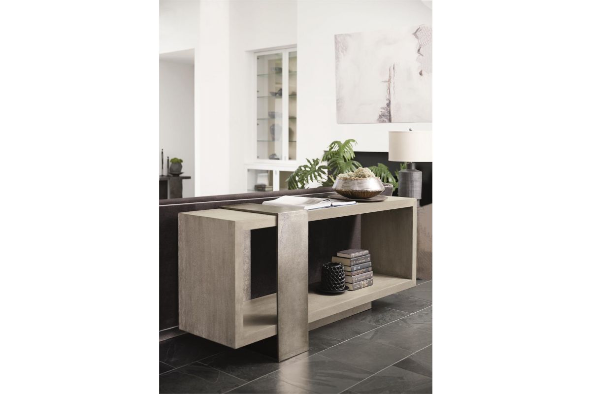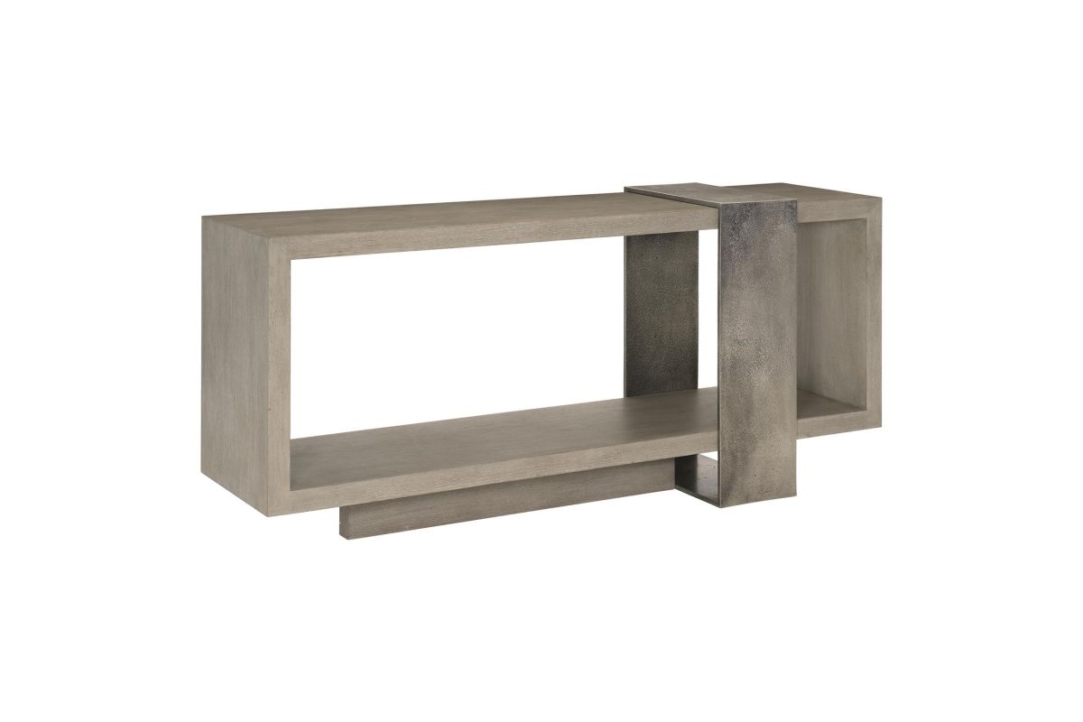 The Bernhardt Linea collection artfully blends the natural elements of rustic design with clean lines and casual but luxurious finishes. Form and function come together in this new-age console table. With an open front-to-back case and a beautifully-designed aluminum wrap across the top and down the front and back, it will make a bold statement in your entranceway, creating an unbeatable first impression.