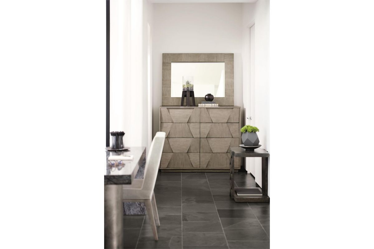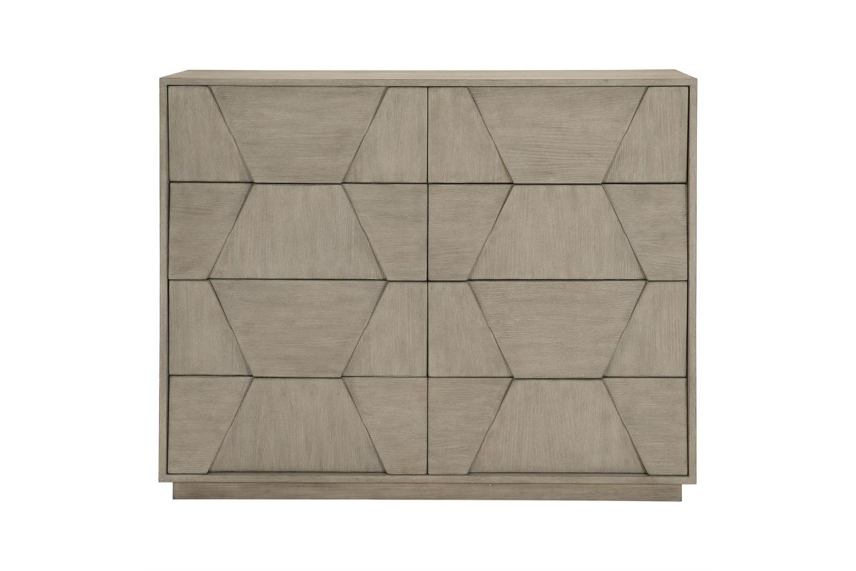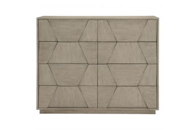 With its flawless artistry and understated elegance, Linea sets a new standard for rustic modern collections. The Linea dresser puts an emphasis on form and finish. Wire-brushed oak veneers in a Cerused Greige finish offer subtle textures, while an eye-catching faceted veneer design adds dimension. The absence of hardware on the eight drawers contributes to the clean, streamlined look.