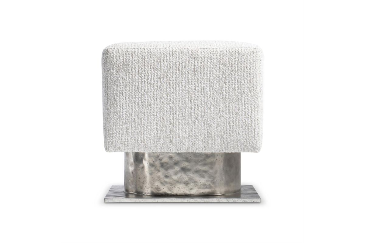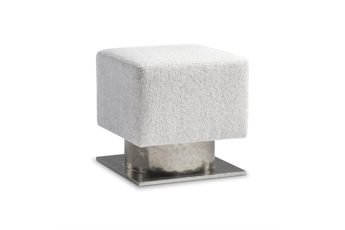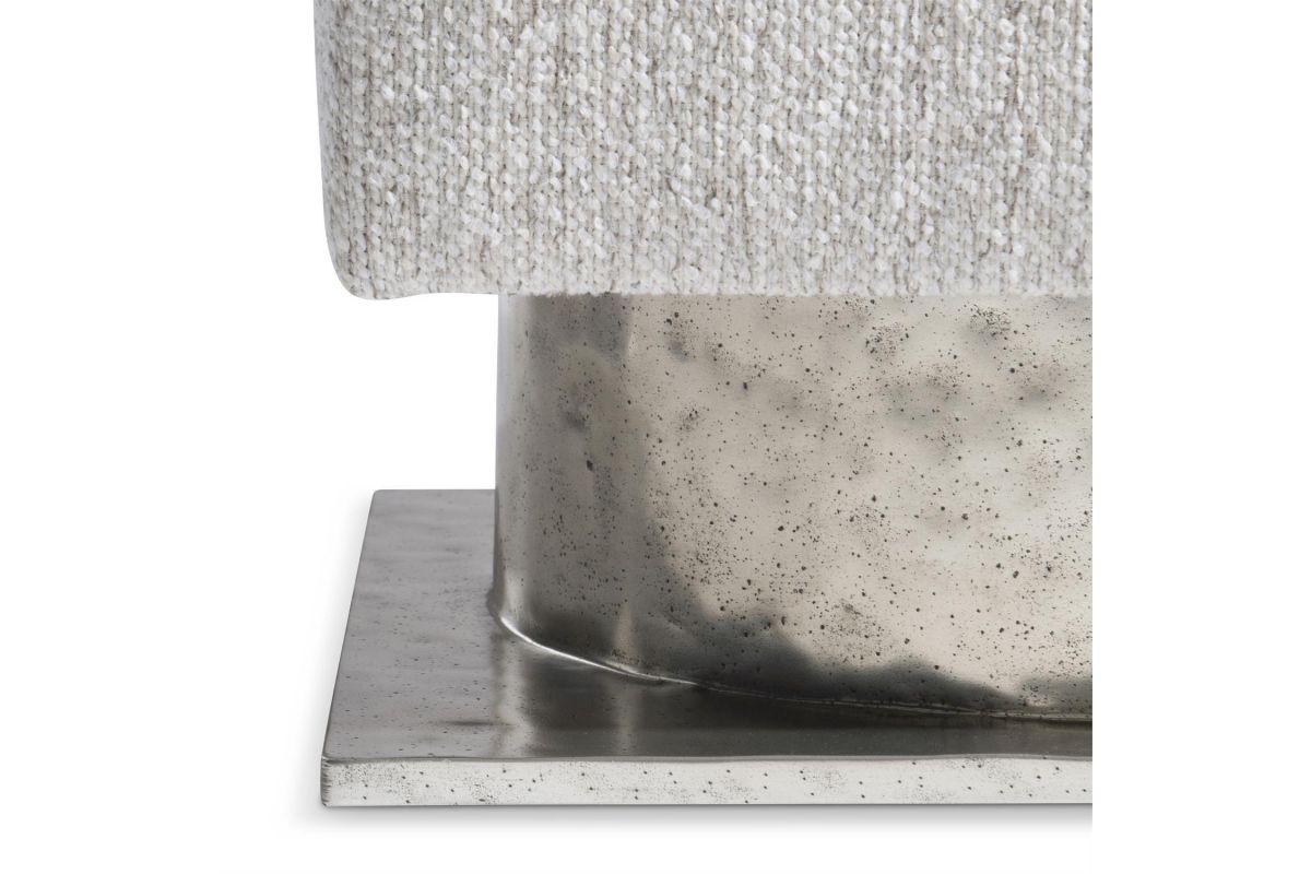 The Prado bench design is inspired by modern architecture, with a square upholstered seat floating above a metal base. The base is formed with a round textured cast aluminum pedestal and square plinth finished in Bright Graphite..