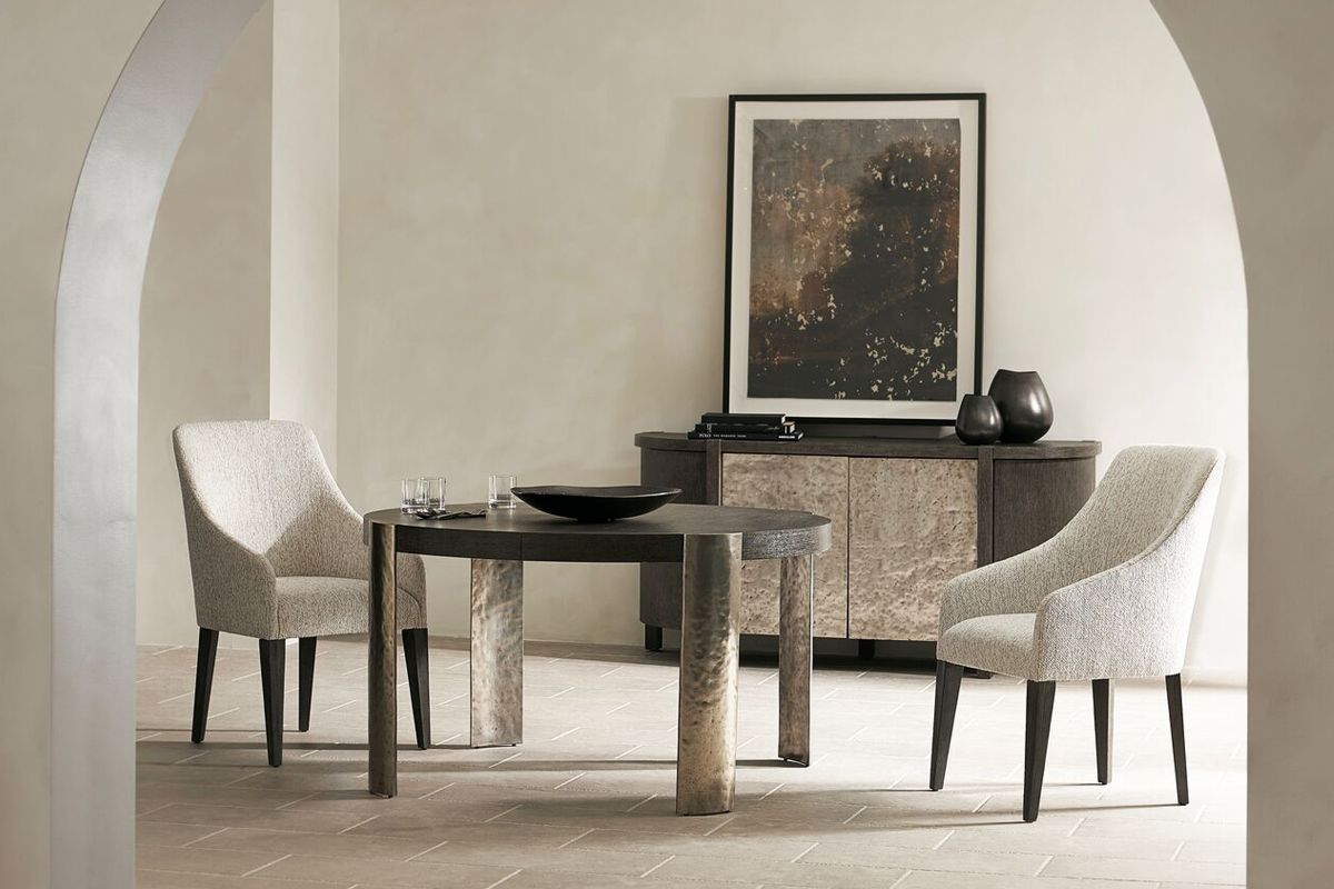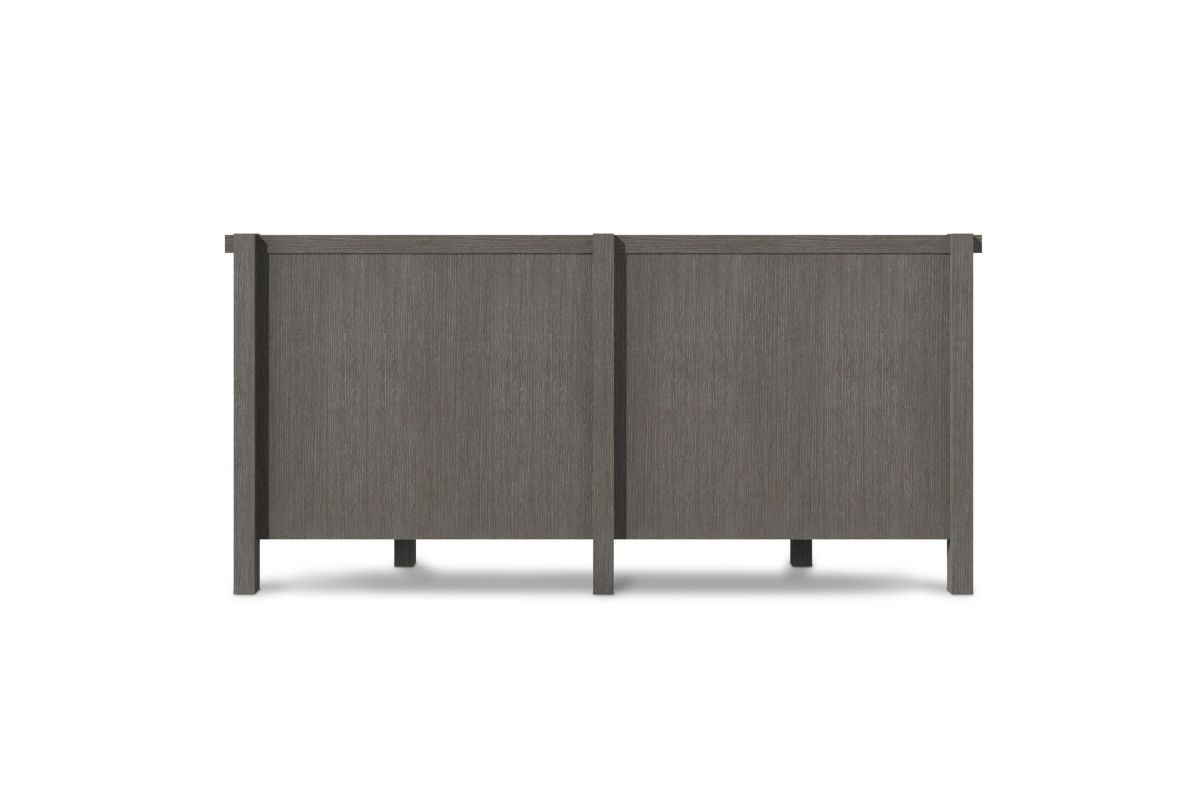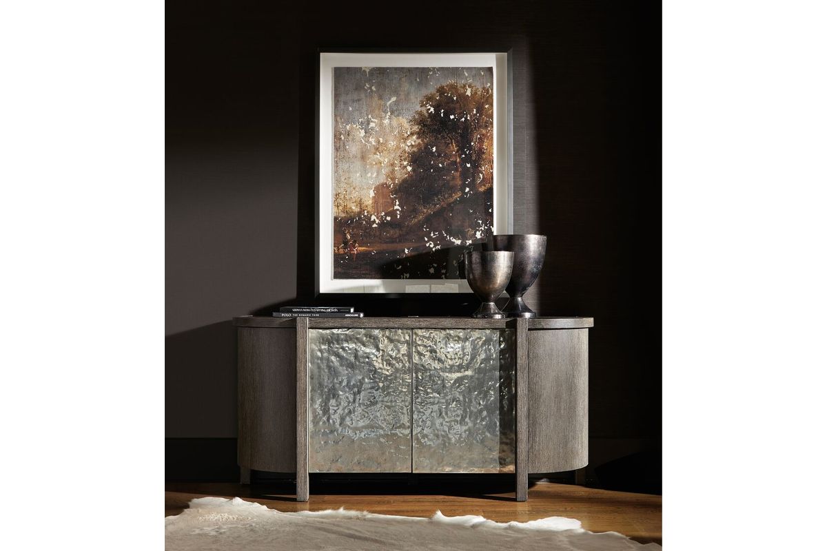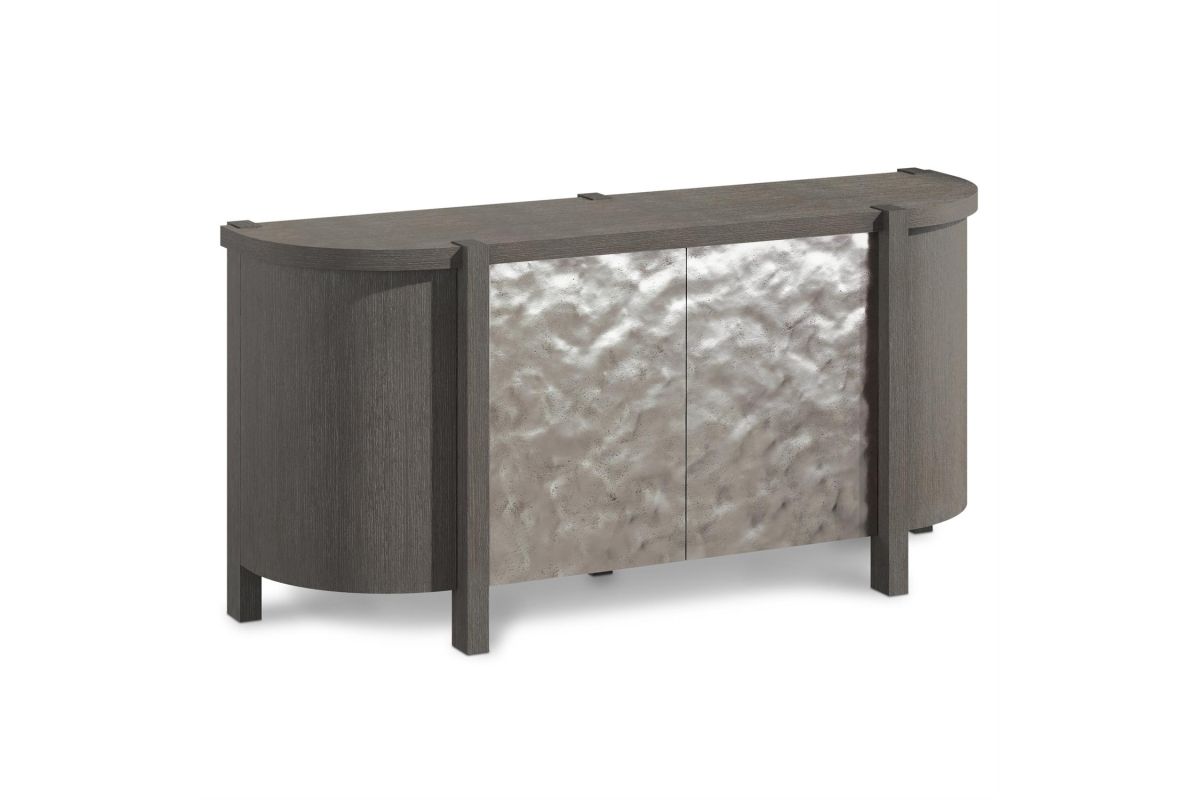 The Prado Buffet molds the idea of modern rustic into a new form. Two center doors shine with fronts wrapped in textured cast aluminum in a Bright Graphite finish. Behind those center doors are adjustable shelves and a drawer. Curved doors on either end of the sideboard open to reveal more storage, with the entire sideboard finished in Porcini.