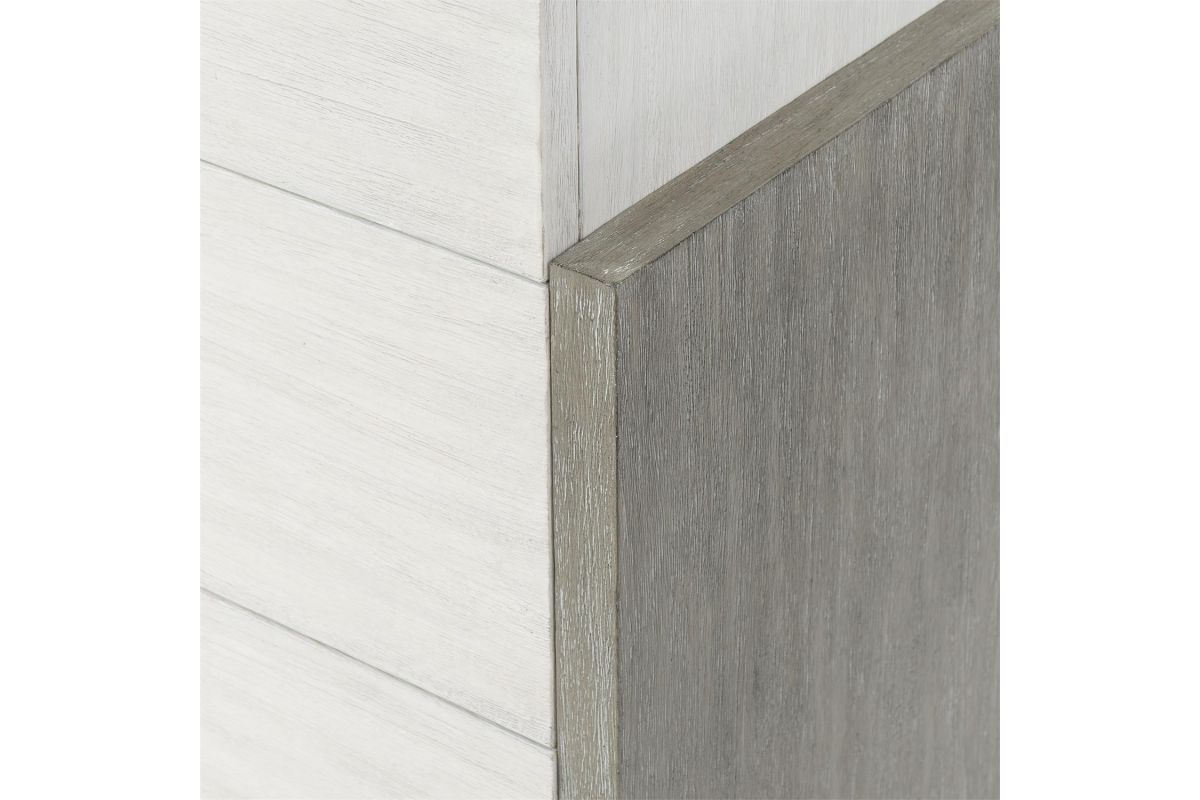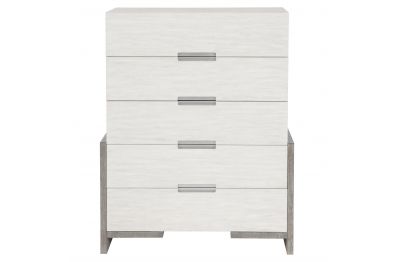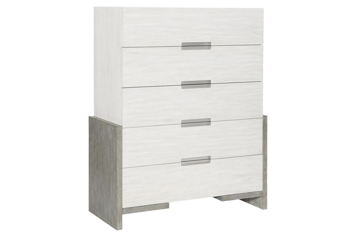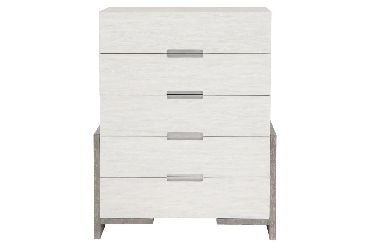Foundations is a new, refined expression of modern rustic, defined by a minimalist style and relaxed comfort. The Foundations tall drawer chest features a two-tone theme and substantial, thick-cut planes. Five drawers, finished in a muted oyster, contrast with its darker wood frame. This handsome piece offers an instant upgrade to any bedroom.