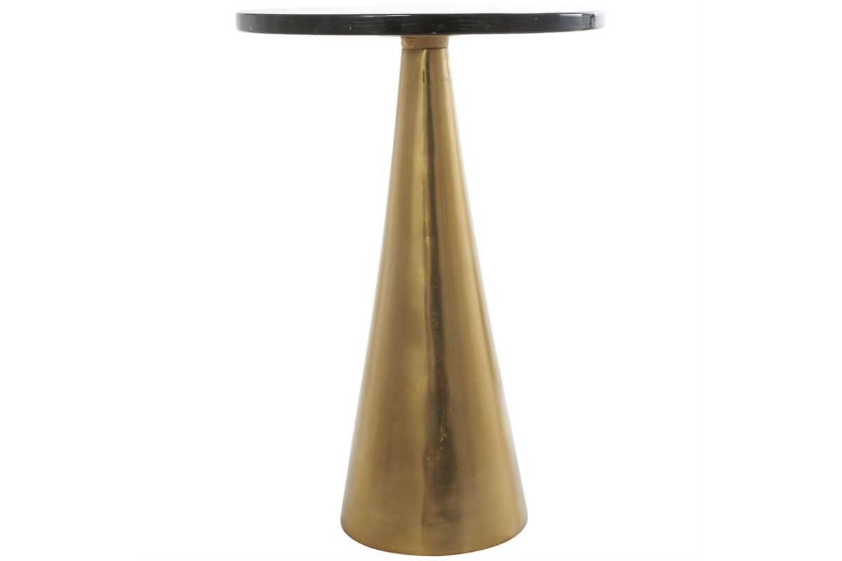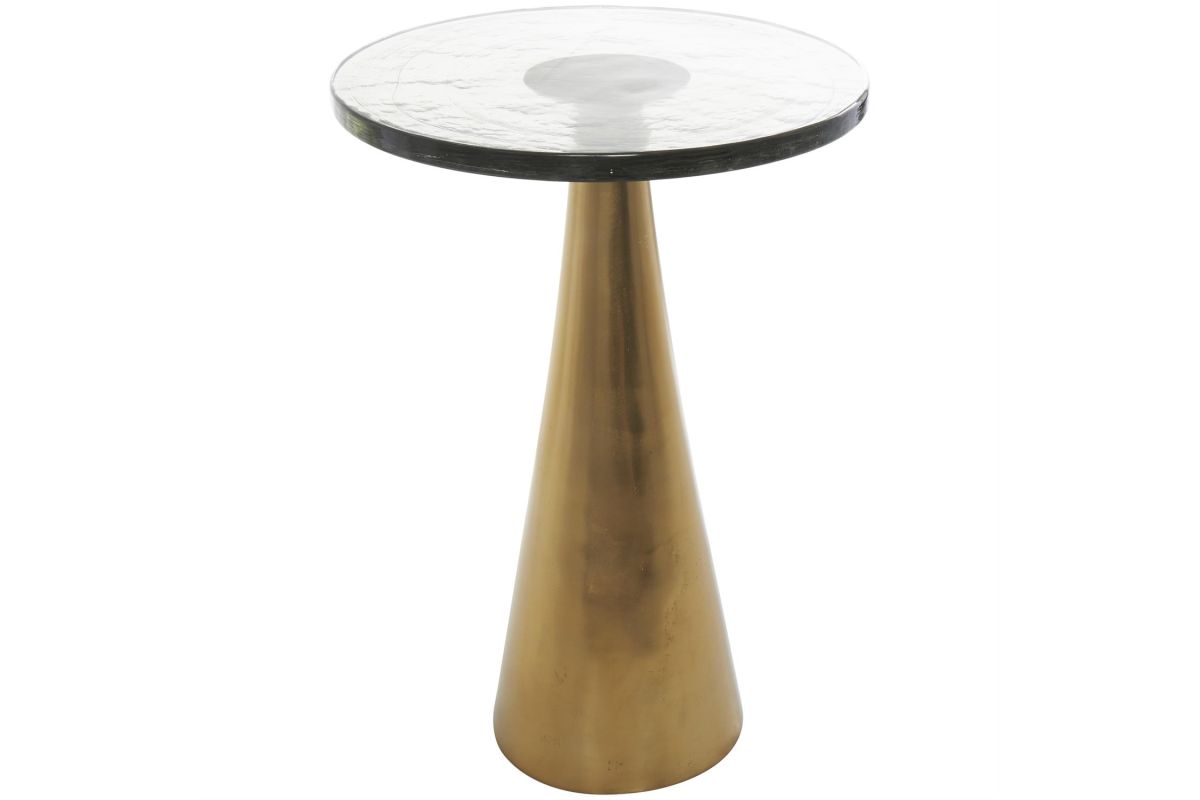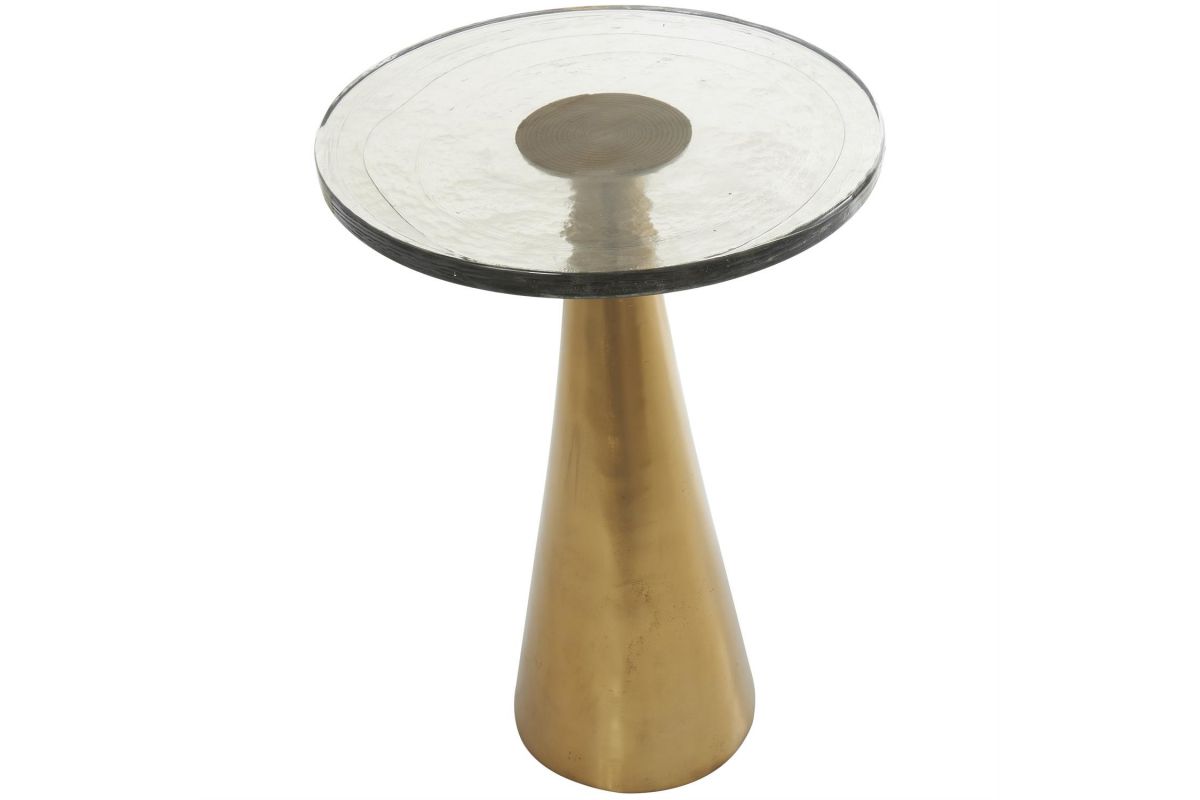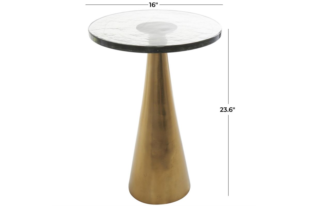 Inspired by sleek elegance and clean lines, a minimalistic design offers effortless luxury with monochromatic tones and bold, angular structures. Crafted from high-quality aluminum, this accent table offers durability while the thick glass top gives it some stability. The side table showcases a luxurious gold color and a sleek finish, with a slightly tinted glass top adding a touch of elegance to any space. With its compact dimensions, this round table provides a versatile surface for holding drinks, books, or displaying decorative items.The gold aluminum metal accent table measures 16L x 16W x 23.6H inches, and weighs 20.95 lbs