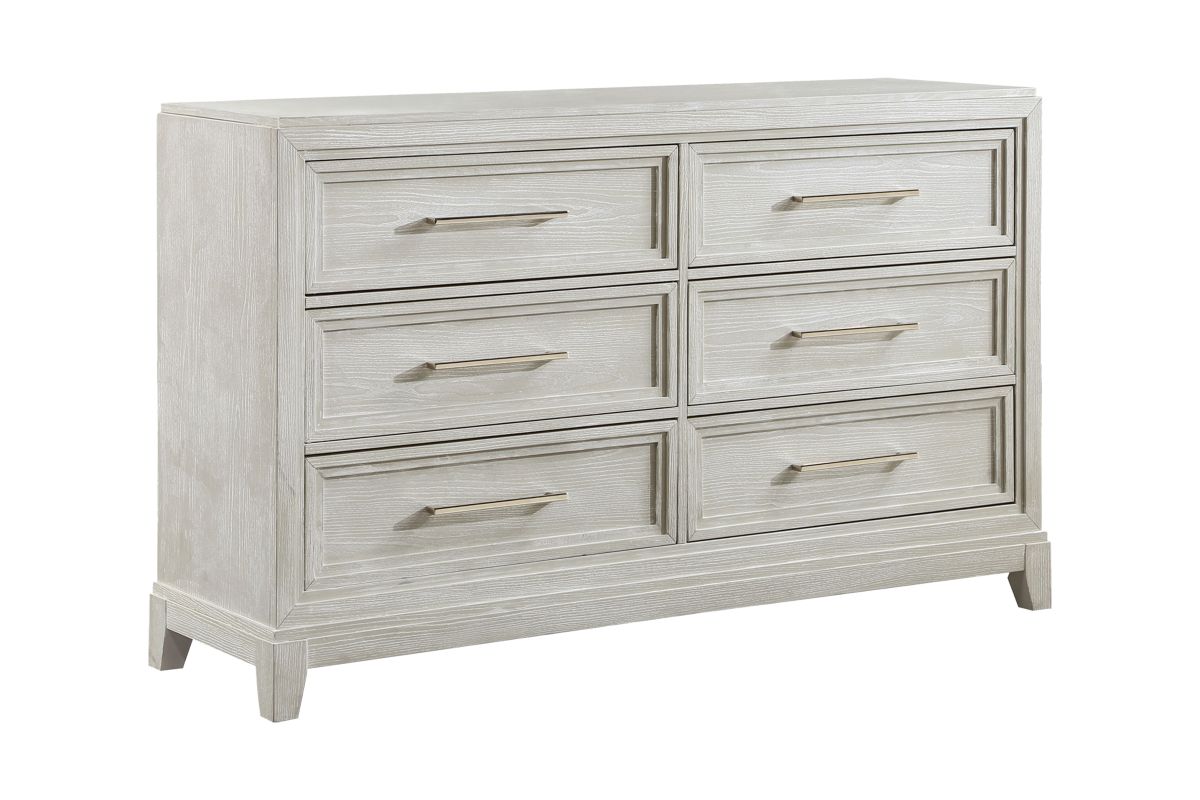Introducing our Meredith exquisite 6-Drawer Cream Dresser, a perfect marriage of elegance and contrast. This dresser not only provides ample storage but also combines the softness of cream with the sophistication of chrome drawer pulls and an oak grain finish, creating a visually stunning and versatile piece for your bedroom.