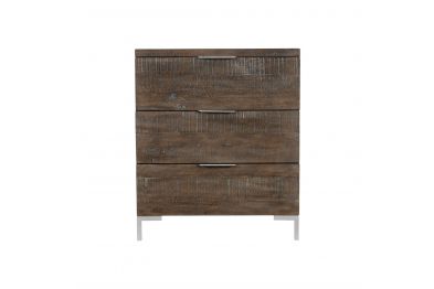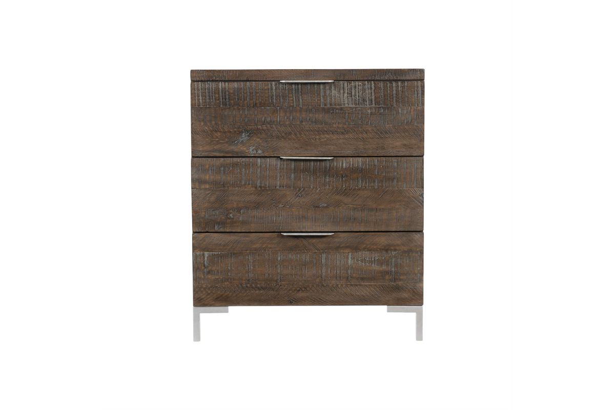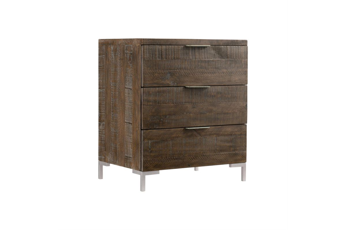 The Loft-Haines collection is casually sophisticated, combining modern minimalism with a cool retro sentiment and 70s revival style. The Haines nightstand marries distressed pine with sleek metal for a rustic modern look. Enhanced by a moody Sable Brown finish, the planked pattern on the top and drawers emphasizes the different textures and shades of the wood. Tubular steel feet are finished in Gray Mist, providing a smooth, industrial contrast to the rustic wood grain.