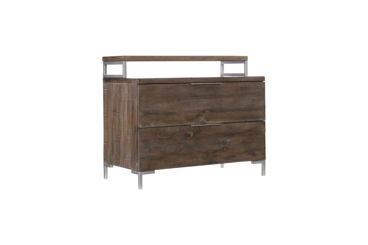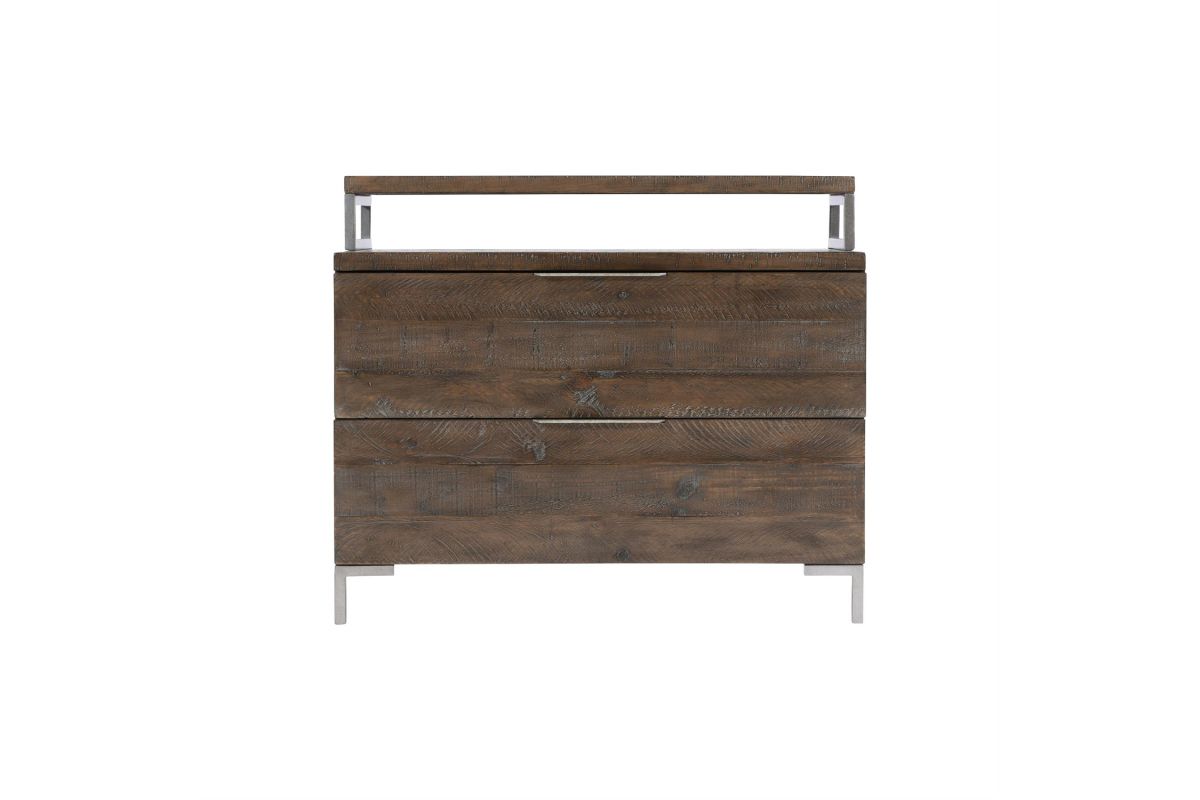 The Loft-Haines collection is casually sophisticated, combining modern minimalism with a cool retro sentiment and 70s revival style. The Haines bachelor's chest marries distressed pine with sleek metal for a rustic modern look. This classic piece brings casual style and ample storage to the bedroom with two drawers and a recessed, removable raised shelf. Tubular steel feet in a Gray Mist finish add a chic industrial detail.